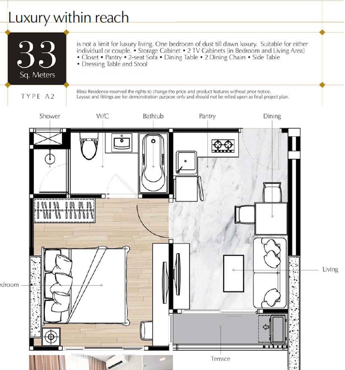 Luxury Corner Unit for Rent – Bless Residence Ekkamai (Sukhumvit 71) Available Now Modern low-rise residence in a quiet, private neighborhood of Ekkamai. ▪ 1 Bedroom | 1 Bathroom ▪ 33 sq.m. | 6th Floo