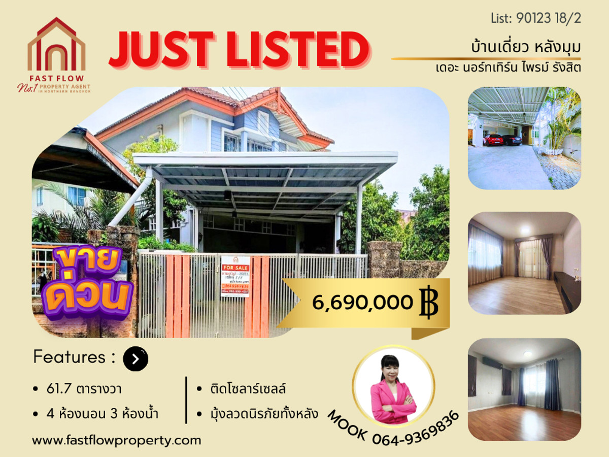 ขาย บ้านเดี่ยว หลังมุม เดอะ นอร์ทเทิร์น ไพร์ม รังสิต พร้อมระบบ Solar Cell ถนนพหลโยธิน ซอยคลวงหลวง 10 ซอยโรงกษาปณ์ ซอยบงกช 42 ใกล้ฟิวเจอร์พาร์ค ต่อเติมครัวไทย ครัวฝรั่ง The Northern Prime MKD สนใจติดต่อ มุกดา Fast Flow Property คลิกเพื่อดูเบอร์โทรติดต่อ Line id: mukda9369 Listing no : 90123 Property Detail: - ขายบ้านเดี่ยว 2 ชั้นหลังมุม โครงการเดอะนอร์ทเทิร์น ไพร์ม by ปริญสิริ - บ้านอยู่ในซอย 4 สุดซอย เงียบสงบ ไม่พลุกพล่าน - ที่ดิน 61.7 ตารางวา - พื้นที่ใช้สอย 150 ตารางเมตร ต่อเติมครัวและโรงรถ ประมาณ 200 ตารางเมตร - หน้าบ้านหันทิศใต้ ลมดี อากาศถ่ายเทสะดวก - หน้าบ้านเป็นฝั่งที่ไม่มีเสาไฟฟ้า ดูสะอาด และปลอดภัย - มี 4 ห้องนอน 3 ห้องน้ำ ห้องนั่งเล่น ห้องทำงาน - ชั้นล่างสามารถทำห้องสำหรับผู้สูงอายุได้ - ต่อเติมครัวไทยด้านหลังบ้าน - ต่อเติมโรงรถ พร้อมปูกระเบื้อง จอดรถในร่มได้ 4 คัน - หลังคาโรงรถ ติดแผงโซล่าเซลล์ 10 Kw 3ph เพียงพอสำหรับใช้ไฟฟ้าในบ้านและโฮมออฟฟิศ ช่วงเวลากลางวัน - ชั้นล่าง+ ชั้นบนปูลามิเนต - ขายพร้อมเครื่องปรับอากาศ 5 เครื่อง - ประตูรั้วสแตนเลส ติดระบบรีโมท - Digital Door lock ที่ตัวบ้าน - ติดตั้งมุ้งลวดนิรภัยทั้งหลัง พร้อมผ้าม่าน Project and Facilities: - โครงการ เดอะนอร์ทเทิร์น ไพรม์ พัฒนาโดยบริษัท ปริญสิริ จำกัด (มหาชน) - คลับเฮ้าส์หรู มีสระว่ายน้ำ / ฟิตเนส/ ซาวน่า - ค่าส่วนกลาง 1,260 บาท ต่อเดือน -ระบบความปลอดภัย 2 ชั้น สแกนทะเบียน ทั้ง 2 ป้อม CCTV และ รปภ. 24 ชั่วโมง - เข้า-ออก หมู่บ้านด้วยระบบ Easy Pass สถานที่ใกล้เคียง: - รถไฟฟ้าสายสีแดง (รังสิต-บางชื่อ) - ใกล้ทางขึ้นทางด่วน ดอนเมืองโทลย์เวย์ - โรงเรียนสารสาสน์วิเทศ สายไหม, โรงเรียนบีคอนเฮาส์ แย้มสอาด, - มหาวิทยาลัยกรุงเทพฯ, มหาวิทยาลัยเทคโนโลยีราชมงคลธัญบุรี, มหาวิทยาลัยรังสิต - โรงพยาบาลสินแพทย์ ลำลูกกา, โรงพยาบาลซีจีเอช สายไหม,โรงพยาบาล บางปะกอก 2 รังสิต - ฟิวเจอร์พาร์ค รังสิต, โลตัส รังสิต, มาร์เก็ตวิลเลจ รังสิต ตำแหน่งที่ตั้ง https://maps.app.goo.gl/c7mQGH2BYBAoGbkS7 ราคา 6,690,000 บาท บริการช่วยเหลือจัดหาสินเชื่อธนาคารฟรี! สามารถนัดเข้าชมสถานที่จริงได้ทุกวัน สนใจราคาคุยกันได้ ติดต่อ คุณสิริลักษณ์ (มุกดา) คลิกเพื่อดูเบอร์โทรติดต่อ Line id: @fastflow ติดต่อ Fast Flow Property Office Tel: คลิกเพื่อดูเบอร์โทรติดต่อ Line id: @fastflow FB page: facebook.com/fastflowproperty www.fastflowproperty.com บริการรับฝากขายอสังหาริมทรัพย์ทุกประเภท ฟรีค่าโฆษณา