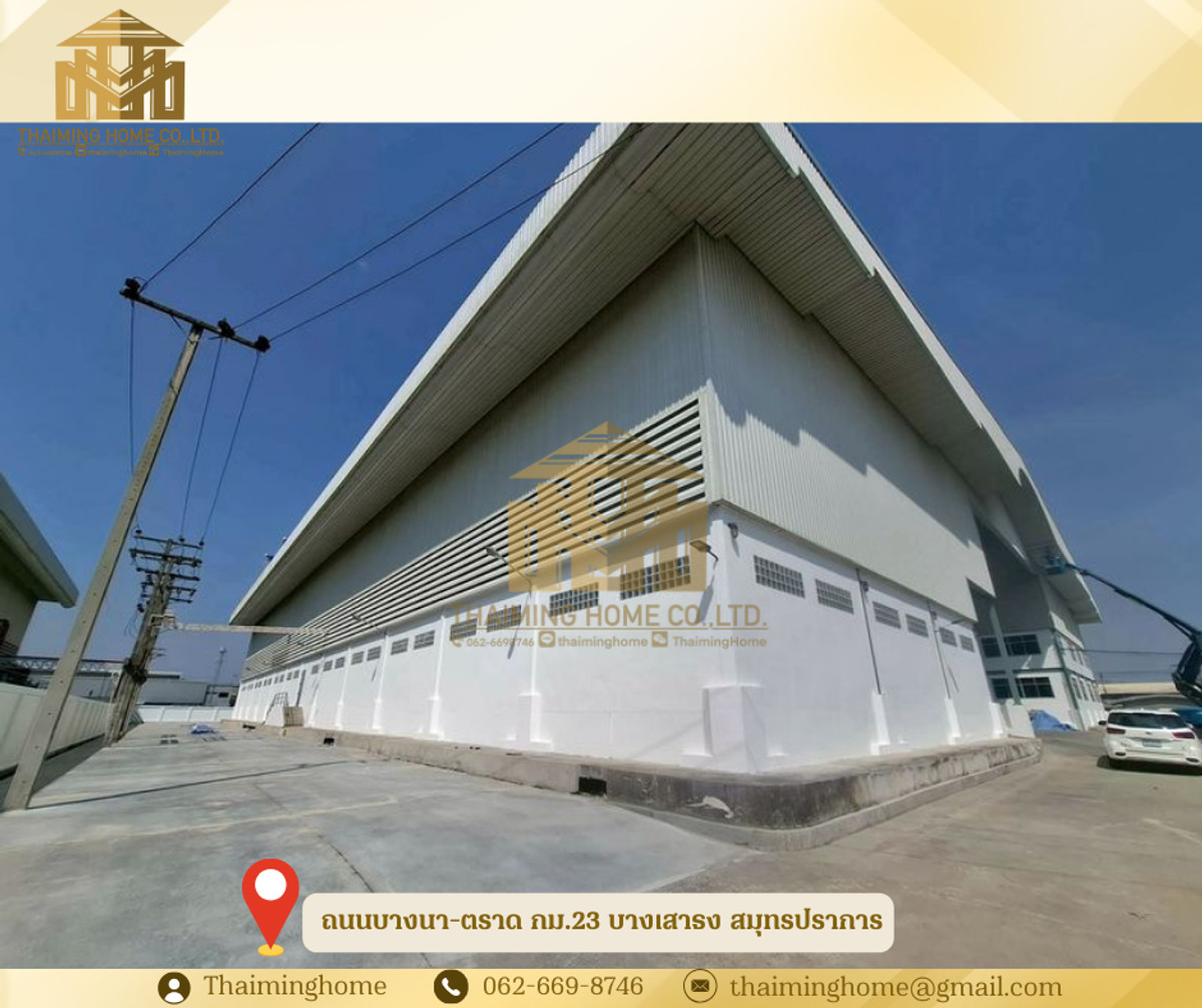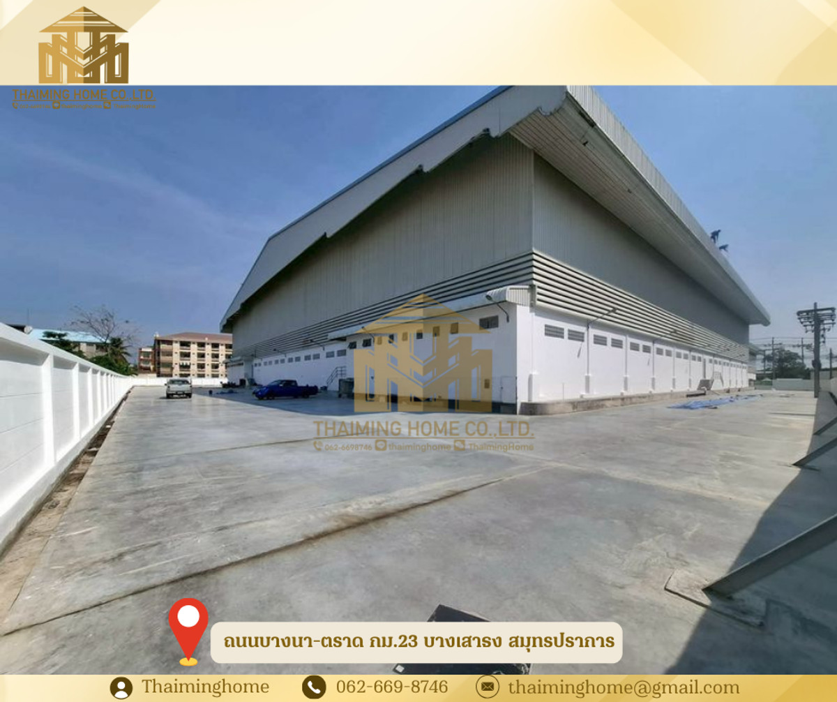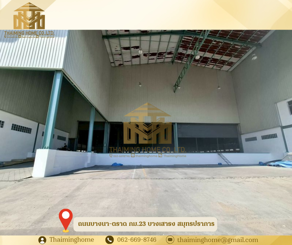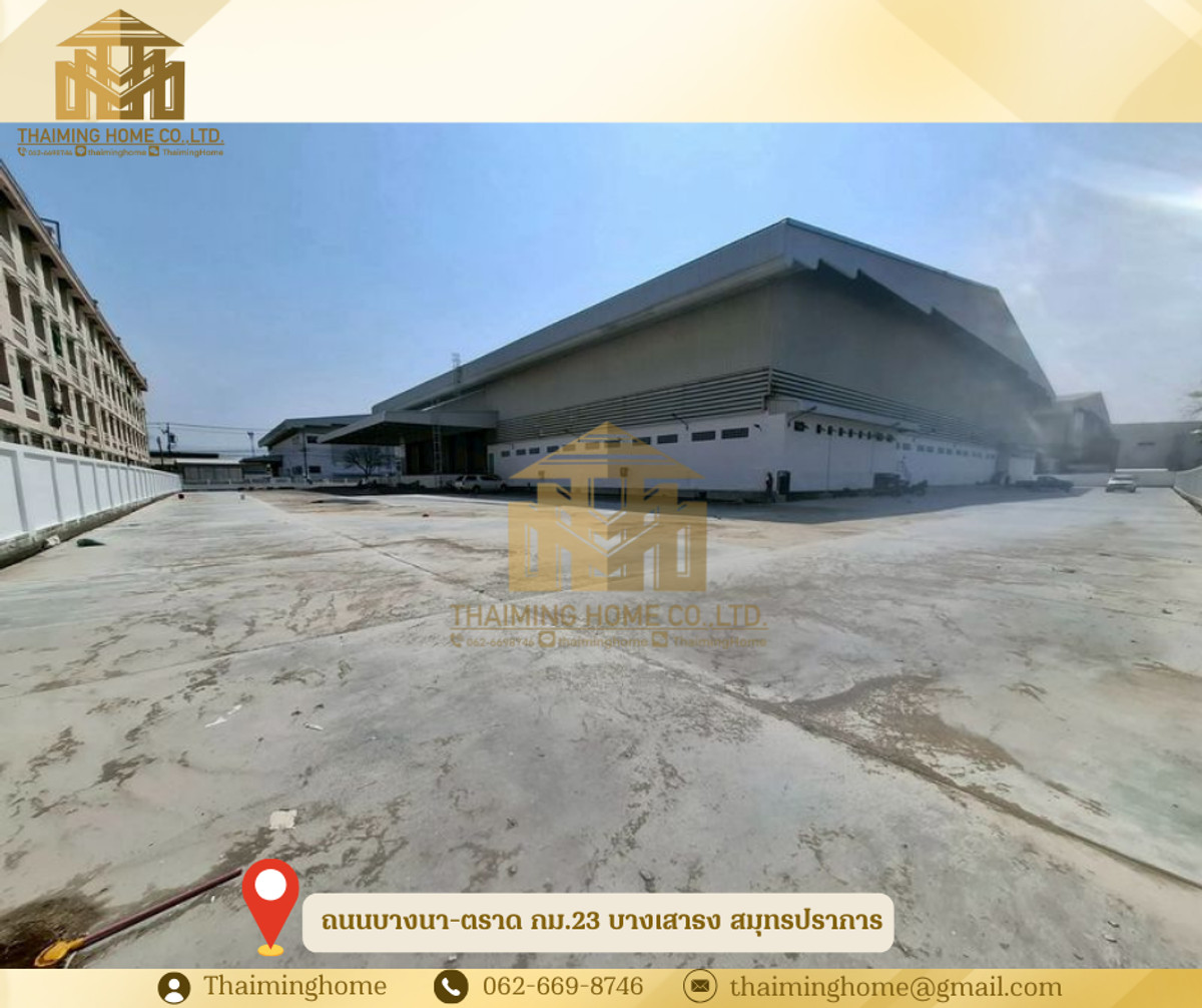 โกดังให้เช่า บางนา-ตราด กม.23 ขนาด5,508 ตร.ม.(TW4-1630626) รายละเอียด - อาคารรวม 5,508 ตร.ม. (ชั้นล่าง 5,364 ตร.ม. + ชั้นบน 144 ตร.ม.) - พื้นที่ Office ชั้น 1: 144 ตร.ม. - พื้นที่ Office ชั้น 2: 144 ตร.ม. - รวม Office: 288 ตร.ม. - ที่ดิน 6 ไร่ + 371.5 ตร.ว. - พื้นที่สีม่วง - รับน้ำหนักพื้น 3 ตัน/ตร.ม. - ความสูงเพดาน 12 เมตร (Clear Height) - 4 Dock ตู้คอนเทนเนอร์ 40 FT (พื้นยก 1.50 เมตร) - 7 Dock รถกระบะ - พร้อมให้เข้าอยู่ 01มีนาคม2026 สถานที่ใกล้เคียง - โรงพยาบาลภัทรินทร์ - ตลาดนางรำ บางเสาธง - ที่ว่าการอำเภอบางเสาธง เงื่อนไข - มัดจำ 3 เดือน + ล่วงหน้า 1 เดือน - สัญญาขั้นต่ำ 3 ปี - พร้อมให้เข้าอยู่ 15/01/2026 (กำลัง Renovate ใหม่) - 150 บาท/ตร.ม. - ค่าเช่ารวม 826,200 บาท/เดือน ---------------------------------------- บริษัท ไทยหมิง โฮม จำกัด Thaiming Home Co.,Ltd. 泰明房园 房产公司 ----------------------- Contact ติดต่อ : คลิกเพื่อดูเบอร์โทรติดต่อ Contact : คลิกเพื่อดูเบอร์โทรติดต่อ คุณหมิง(中文) Line ID: thaiminghome Line ID: @thaiminghome https://lin.ee/PkkHwYv Wechat : ThaimingHome E-mail : คลิกเพื่อดูอีเมล -----------------------