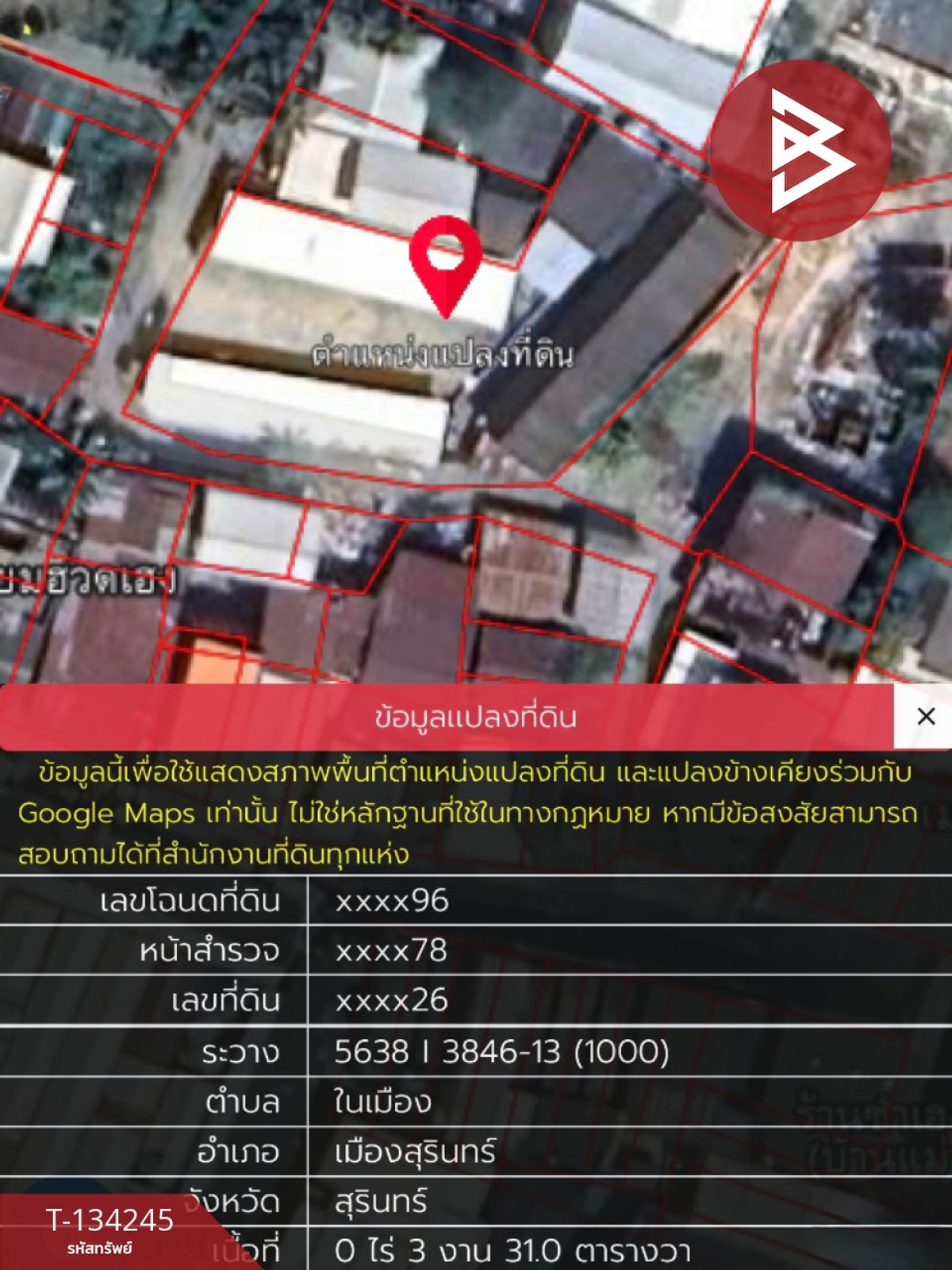 ที่ดินพร้อมสิ่งปลูกสร้าง : ในเมือง สุรินทร์ ที่ตั้ง : ต.ในเมือง อ.เมืองสุรินทร์ จ.สุรินทร์ รหัสทรัพย์ : T-134245 ประเภท : ที่ดิน เนื้อที่ : 3 งาน 31.0 ตารางวา รายละเอียดเพิ่มเติม : โอกาสทองของคนทำธุรกิจ ใจกลางเมือง ที่ดินทำเลดี เดินทางสะดวก ใกล้แหล่งงานและหน่วยงานสำคัญ รองรับการพัฒนาเป็นอพาร์ทเม้นท์ โรงแรม หรือโครงการที่พักอาศัย ปัจจุบันมีห้องเช่า 11 ห้อง พร้อมรายได้ต่อเนื่อง มีพื้นที่ให้เช่าที่จอดรถรายเดือน ลงทุนวันนี้ ต่อยอดได้ทันที ทั้งสร้างรายได้ระยะสั้น และเพิ่มมูลค่าในระยะยาว ราคา : 11,800,000 บาท ลิงค์แผนที่ : https://maps.google.com/?q=14.88826909,103.49117525 **เรามีบริการจัดสินเชื่อให้ฟรี พร้อมยินดีให้คำปรึกษา มีให้เลือกทุกธนาคาร** **พร้อมอัตราดอกเบี้ยพิเศษ และ วงเงินสูงสุด 90-100% ของราคาประเมิน** สนใจสอบถามข้อมูลเพิ่มเติม หรือ นัดชมบ้านได้ที่ Tel : คลิกเพื่อดูเบอร์โทรติดต่อ เมญ่า (รหัสตัวแทน 6648) Line ID : mampakkamon Callcenter : คลิกเพื่อดูเบอร์โทรติดต่อ สนใจดูทรัพย์อื่นๆ เพิ่มเติม มากกว่า 3,000 รายการ www.tb.co.th The Best Property Agent CO,.LTD. ผู้นำด้านธุรกิจนายหน้า ตัวแทนอสังหาริมทรัพย์ครบวงจร ด้วยความเป็นมืออาชีพ ใช้เทคโนโลยี และ นวัตกรรมที่สร้างสรรค์ เพื่อส่งมอบบริการที่ดีที่สุดเพื่อคุณ ให้บริการด้าน ซื้อ ขาย เช่า อสังหาริมทรัพย์