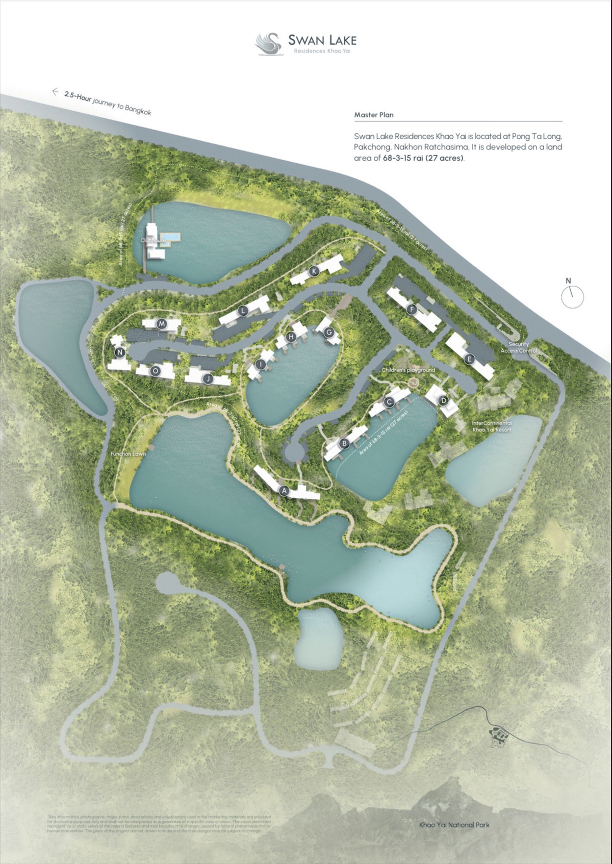 โครงการ Swan Lake Residence (Luxury Condominium) "ที่นี่ธรรมชาติสมบูรณ์บนเขาใหญ่" นี่คือแนวความคิด ซึ่งเป็นจุดเริ่มต้น ก่อนที่พื้นที่กว่า 68 ไร่จะกลายเป็น สถานที่พักผ่อนบนเขาใหญ่ ที่รายล้อมด้วย ธรรมชาติที่สมบูรณ์ ทุกอย่างเกิดขึ้นจากความตั้งใจในการพัฒนาโครงการ Swan Lake เป็น low rise condominium ทุกยูนิตสามารถมองเห็น วิวได้ 360 องศา โดยไม่บังกัน ตัวอาคารออกแบบให้เป็นแนวนอนเพื่อให้กลมกลืนกับธรรมชาติ ถูกออกแบบ แบบ "Single Corridor" เนื้อที่ขายทั้งหมด 68 ไร่ ทั้งหมด 15 อาคาร จำนวน 282 ยูนิต