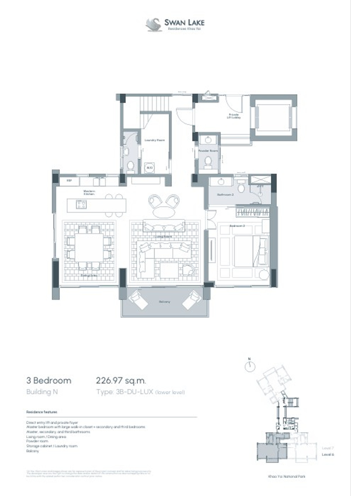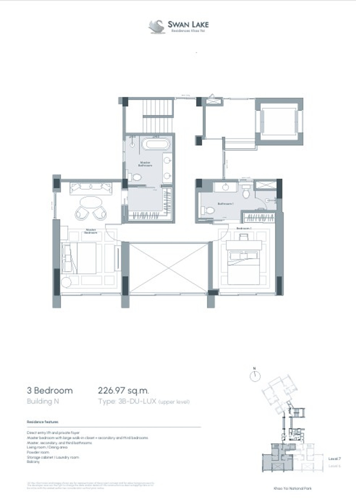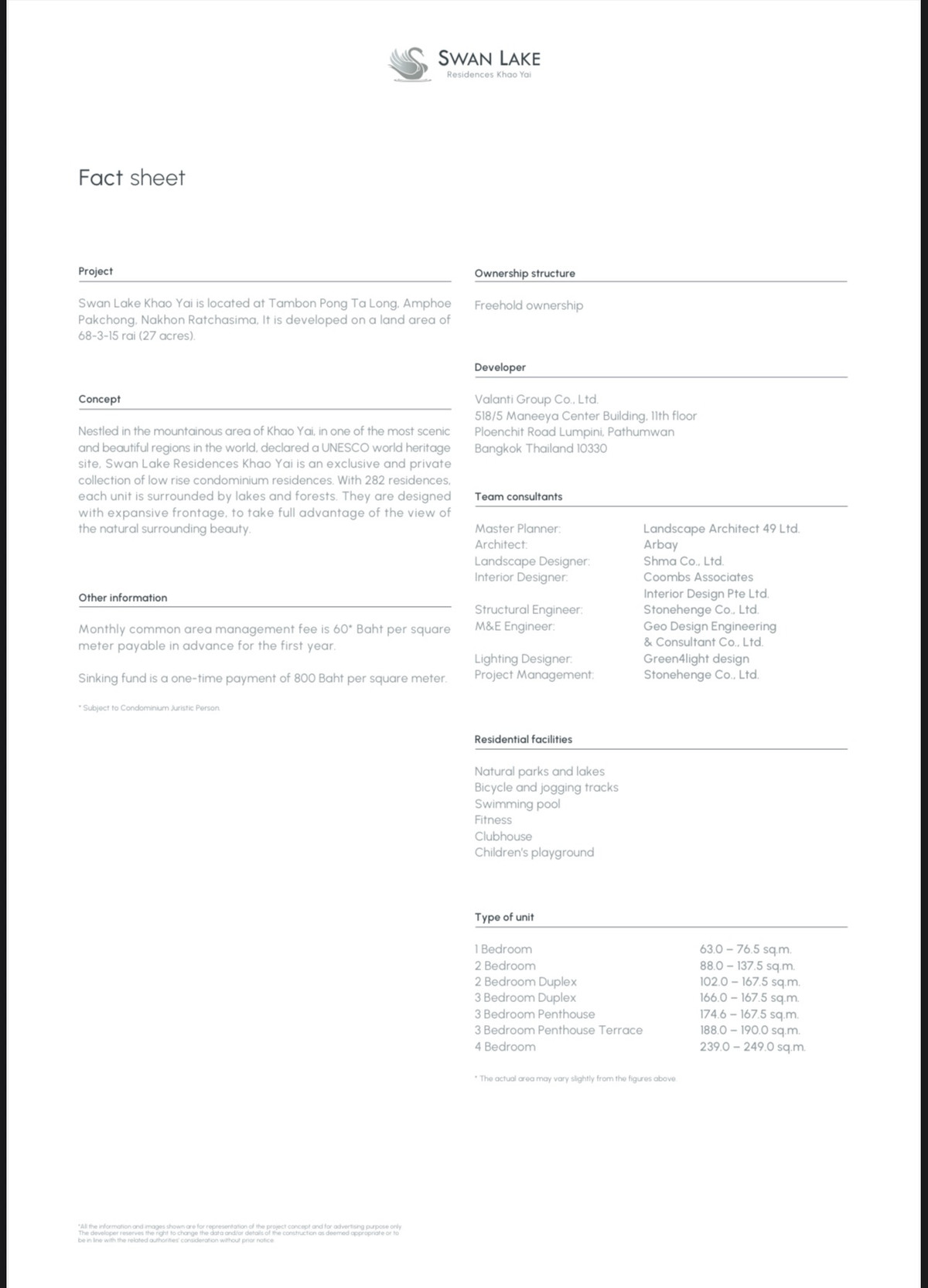 โครงการ Swan Lake Residence (Luxury Condominium) "ที่นี่ธรรมชาติสมบูรณ์บนเขาใหญ่" นี่คือแนวความคิด ซึ่งเป็นจุดเริ่มต้น ก่อนที่พื้นที่กว่า 68 ไร่จะกลายเป็น สถานที่พักผ่อนบนเขาใหญ่ ที่รายล้อมด้วย ธรรมชาติที่สมบูรณ์ ทุกอย่างเกิดขึ้นจากความตั้งใจในการพัฒนาโครงการ Swan Lake เป็น low rise condominium ทุกยูนิตสามารถมองเห็น วิวได้ 360 องศา โดยไม่บังกัน ตัวอาคารออกแบบให้เป็นแนวนอนเพื่อให้กลมกลืนกับธรรมชาติ ถูกออกแบบ แบบ "Single Corridor" เนื้อที่ขายทั้งหมด 68 ไร่ ทั้งหมด 15 อาคาร จำนวน 282 ยูนิต