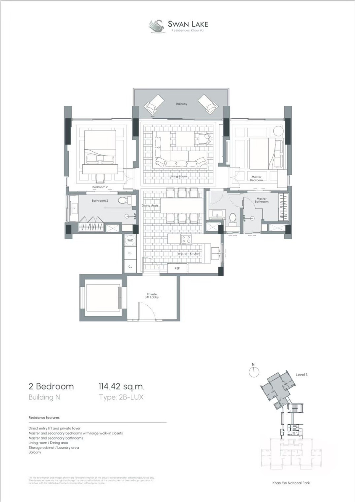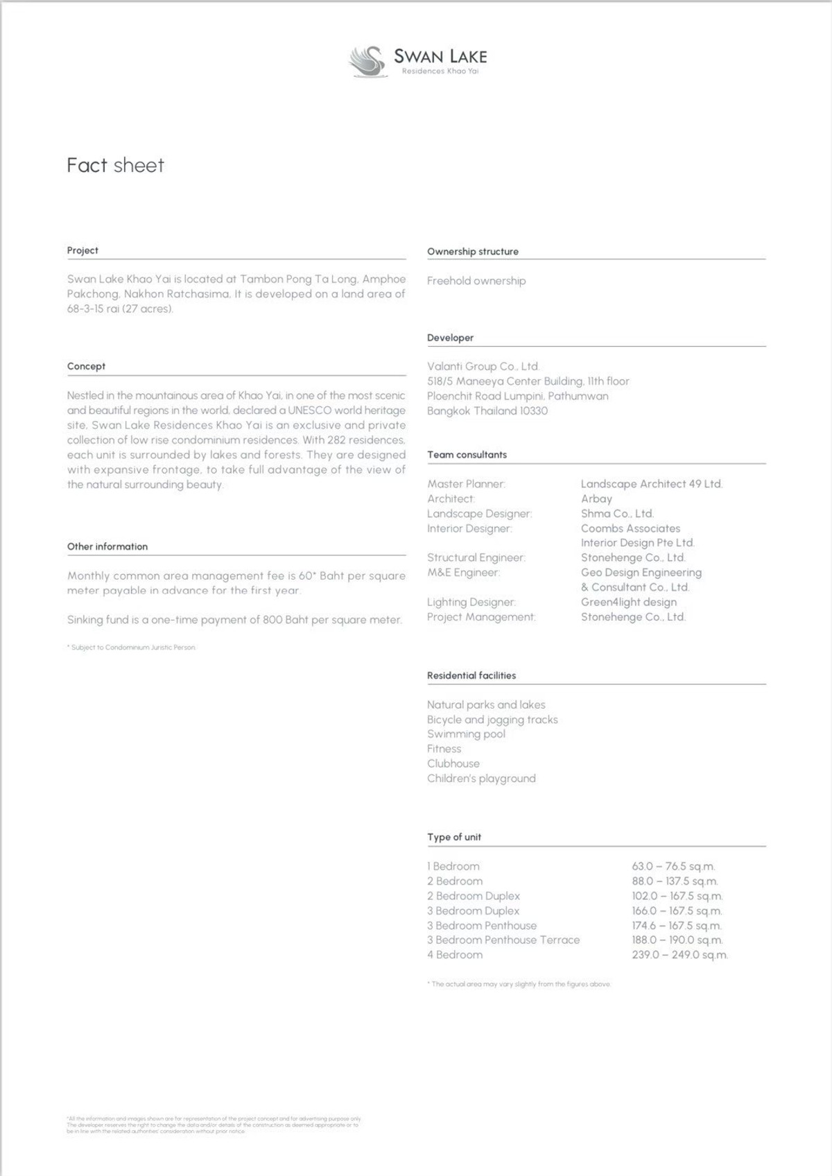 โครงการ Swan Lake Residences (Luxury Condominium) "ที่นี่ธรรมชาติสมบูรณ์บนเขาใหญ่" นี่คือแนวความคิด ซึ่งเป็นจุดเริ่มต้น ก่อนที่พื้นที่กว่า 68 ไร่จะกลายเป็น สถานที่พักผ่อนบนเขาใหญ่ ที่รายล้อมด้วย ธรรมชาติที่สมบูรณ์ ทุกอย่างเกิดขึ้นจากความตั้งใจในการพัฒนาโครงการ Swan Lake เป็น low rise condominium ทุกยูนิตสามารถมองเห็น วิวได้ 360 องศา โดยไม่บังกัน ตัวอาคารออกแบบให้เป็นแนวนอนเพื่อให้กลมกลืนกับธรรมชาติ ถูกออกแบบ แบบ "Single Corridor" เนื้อที่ขายทั้งหมด 68 ไร่ ทั้งหมด 15 อาคาร จำนวน 282 ยูนิต