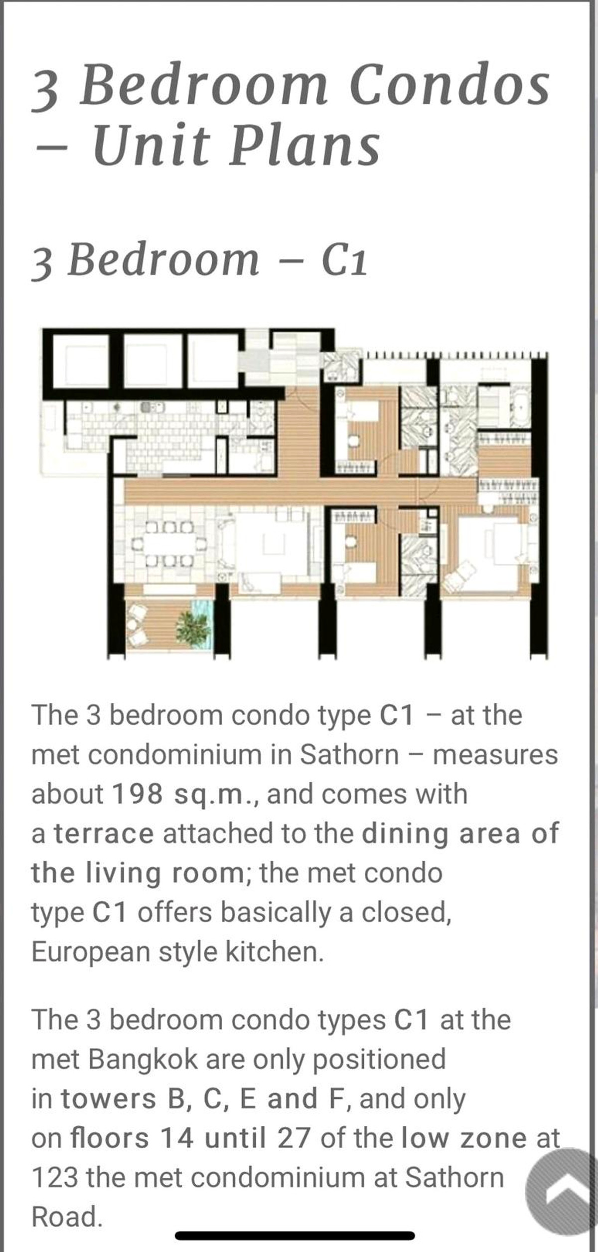 The 3 bedroom condo type C1 - at the met condominium in Sathorn - measures about 198 sq.m., and comes with a terrace attached to the dining area of the living room; the met condo type C1 offers basically a closed, European style kitchen. The 3 bedroom condo types C1 at the met Bangkok are only positioned in towers B, C, E and F, and only on floors 14 until 27 of the low zone at 123 the met condominium at Sathorn Road. คอนโดมิเนียมแบบ 3 ห้องนอน รุ่น C1 ที่เดอะเมท คอนโดมิเนียม สาธร มีพื้นที่ประมาณ 198 ตารางเมตร และมีระเบียงเชื่อมต่อกับพื้นที่รับประทานอาหารของห้องนั่งเล่น โดยคอนโดมิเนียมแบบ C1 ของเดอะเมทนั้นมีห้องครัวแบบปิดสไตล์ยุโรป คอนโดมิเนียมแบบ 3 ห้องนอน รุ่น C1 ที่เดอะเมท กรุงเทพฯ มีเฉพาะในอาคาร B, C, E และ F สนใจติดต่อline @resaleproperty หรือโทร คลิกเพื่อดูเบอร์โทรติดต่อ moo ag