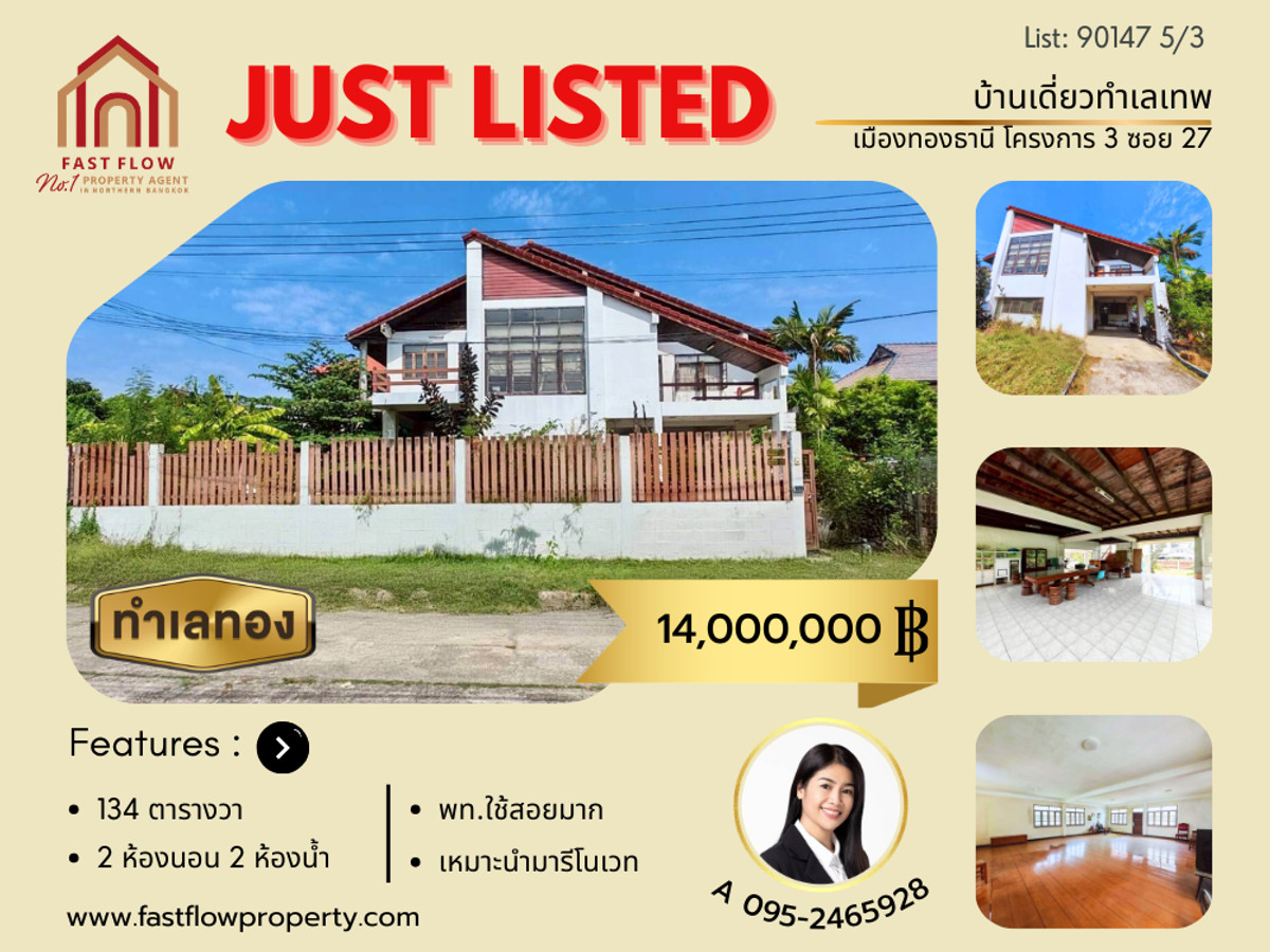 ขายบ้านเดี่ยว 134 ตรว. ในเมืองทองธานี แจ้งวัฒนะ- ติวานนท์ ใกล้อิมแพคเมืองทองธานี เหมาะสำหรับรีโนเวท ใกล้ทางด่วนเมืองทองธานี ARA สนใจติดต่อ คุณเอ- อารยา Fast Flow Property โทร คลิกเพื่อดูเบอร์โทรติดต่อ, คลิกเพื่อดูเบอร์โทรติดต่อ Official Line : @fastflow Listing no: 90147 Property Detail: - ขายที่ดินพร้อมสิ่งปลูกสร้าง บ้านเดี่ยว 2 ชั้น ในเมืองทองธานี โครงการ 3 ซอย 27 - ทำเลศักยภาพเชื่อมต่อถนนแจ้งวัฒนะ และถนนติวานนท์ - ที่ดิน 134 ตารางวา - สิ่งปลูกสร้างเดิมมีพื้นที่ใช้สอยประมาณ 245 ตารางเมตร - ตัวบ้านเดิมยังคงมีโครงสร้างที่แข็งแรง เป็นโถงใต้ถุนสูง พื้นชั้นบน เป็นไม้เนื้อแข็ง ผสมผสานกับบ้านตึกในส่วนของตัวบ้านหลัก - บ้านออกแบบโดยแบ่งพื้นที่เป็น 2 ส่วน คือ ส่วนของการพักผ่อนร่วมกันกับครอบครัว สไตล์บ้านทรงไทยประยุกต์ ที่เน้นเป็นพื้นไม้แข็ง โถงกว้างเพดานสูง รวมถึงใต้ถุนสูง - และส่วนของที่พักอาศัย ชั้นบน มีห้องนอน 2 ห้อง และ ห้องน้ำ 2 ห้อง ระเบียงทั้งหน้าบ้านและหลังบ้าน ชั้นล่าง มีห้องแม่บ้าน และห้องครัว รวมถึงส่วน ต่อเติมทำเป็นห้องทำงานด้านล่าง - เหมาะที่จะรีโนเวทใหม่เพื่อการอยู่อาศัย - หน้าบ้านหันทางทิศตะวันออกเฉียงใต้ ลมพัดเย็นตลอดทั้งปี *** ราคา 14,000,000 บาท*** (สามารถต่อรองได้พอสมควร) บริการช่วยเหลือจัดหาสินเชื่อธนาคารฟรี! พิกัดที่ตั้ง : เมืองทองธานีโครงการ 3 ซอย 27 https://maps.app.goo.gl/ZdwbkG4pXtkUTDbN7 สถานที่ใกล้เคียง: - รถไฟฟ้าสายสีชมพู สถานีแยกปากเกร็ด, สถานีเลี่ยงเมืองปากเกร็ด, ทางด่วนศรีรัช (ด่านแจ้งวัฒนะ) - เซ็นทรัล แจ้งวัฒนะ, บิ๊กซี แจ้งวัฒนะ 2, โฮมโปร แจ้งวัฒนะ, ตลาดนัดเมืองทองธานี, คอสโม บาซาร์, บีไฮฟ ไลฟ์สไตล์มอลล์, ตลาดสหกรณ์บริการ 1 - โรงเรียนสวนกุหลาบวิทยาลัย นนทบุรี, โรงเรียนอัมพรไพศาล, โรงเรียนพิชญศึกษา, มหาวิทยาลัยสุโขทัยธรรมาธิราช, สถาบันการจัดการปัญญาภิวัฒน์, โรงเรียนนานาชาติเซนต์แอนดรูว์ส สามัคคี - โรงเรียนเวิลด์เมดิคอล, โรงพยาบาลวิภาราม ปากเกร็ด, โรงพยาบาลกรุงไทย, ศูนย์การแพทย์ปัญญานันทภิกขุ ชลประทาน, โรงพยาบาลมงกุฎวัฒนะ - สำนักงานเทศบาลนครปากเกร็ด, ที่ว่าการอำเภอปากเกร็ด, ศูนย์ราชการเฉลิมพระเกียรติฯ แจ้งวัฒนะ, อิมแพ็ค เมืองทองธานี, สวนสมเด็จพระศรีนครินทร์ นนทบุรี - สามารถเข้า-ออก จากซอยแจ้งวัฒนะ-ปากเกร็ด 11, 19, 21, 24 สามารถนัดเข้าชมสถานที่จริงได้ทุกวัน สนใจราคาคุยกันได้ คุณเอ- อารยา Fast Flow Property โทร คลิกเพื่อดูเบอร์โทรติดต่อ , คลิกเพื่อดูเบอร์โทรติดต่อ Official Line : @fastflow ติดต่อ Fast Flow Property Office Tel: คลิกเพื่อดูเบอร์โทรติดต่อ FB page: facebook.com/fastflowproperty www.fastflowproperty.com บริการรับฝากขายอสังหาริมทรัพย์ทุกประเภท ฟรีค่าโฆษณา