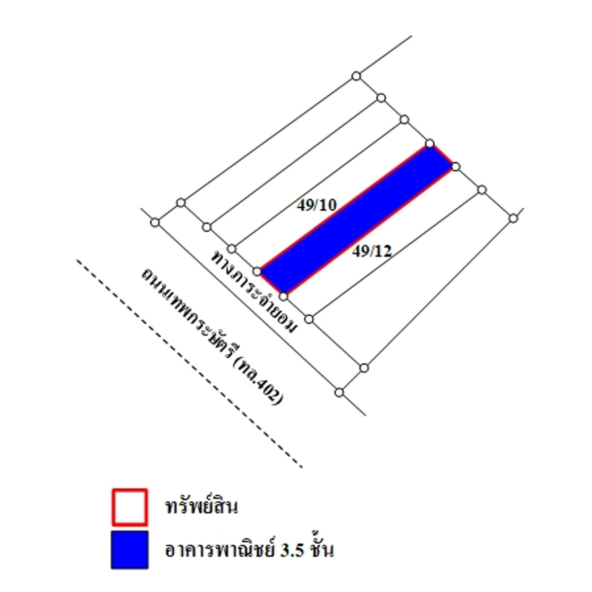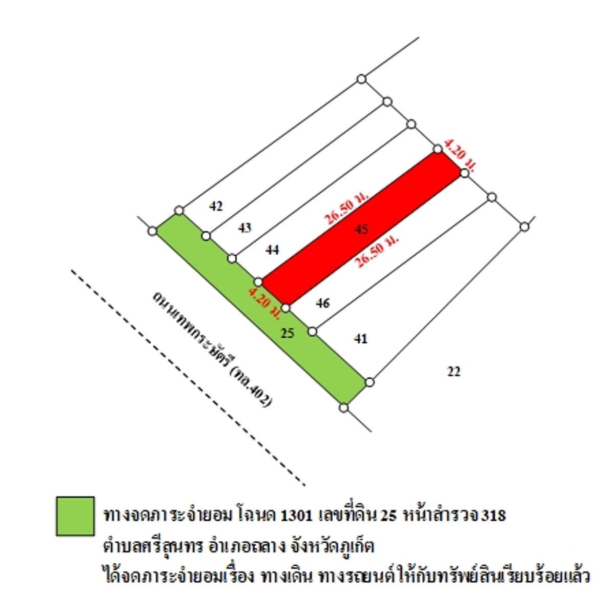 ที่ดินเป็นรูปสี่เหลี่ยมผืนผ้า ขนาดแปลงที่ดินด้านทิศตะวันตกติดถนน กว้างประมาณ 4.2 ม. ลึกประมาณ 26.5 ม. 3.5 ชั้น เลขที่ 49/11 ถนนผ่านหน้าทรัพย์สิน ได้แก่ ถนนภายในโครงการฯ เป็นทางส่วนบุคคลที่มีการจดภาระจำยอมแล้ว ผิวจราจรคอนกรีต กว้างประมาณ 3 ม. เขตทางกว้างประมาณ 3 ม. หมายเหตุ : - ทรัพย์สินตั้งอยู่ในย่านที่อยู่อาศัย และพาณิชยกรรม สาธารณูปโภคครบครัน การคมนาคมสะดวก - สถานที่สำคัญบริเวณใกล้เคียง ได้แก่ การไฟฟ้าส่วนภูมิภาคอำภอถลาง และอนสาวรีย์ท้าวเทพกระษัตรี ท้าวศรีสุนทร เป็นต้น สนใจติดต่อ ออย คลิกเพื่อดูเบอร์โทรติดต่อ
