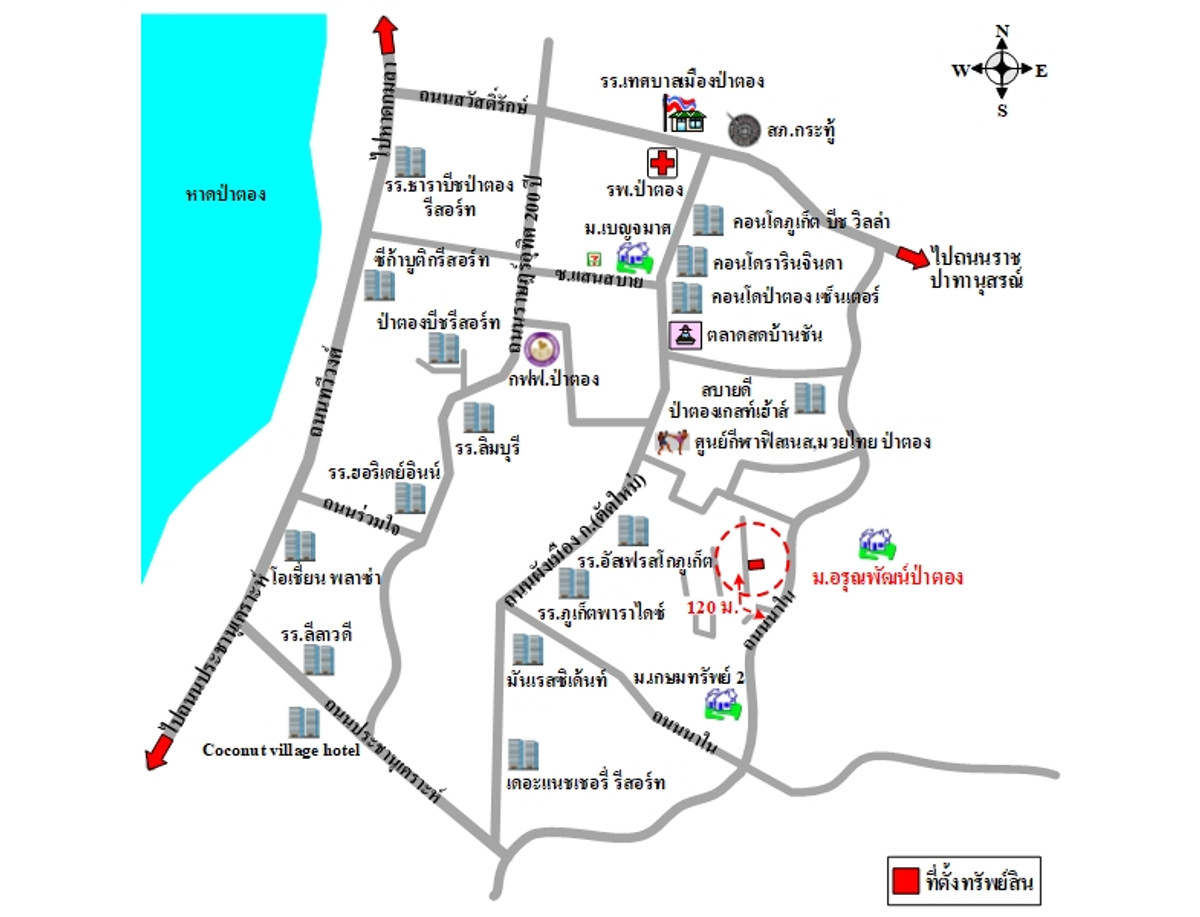 ที่ดินเป็นรูปสี่เหลี่ยมผืนผ้า ขนาดแปลงที่ดินด้านทิศตะวันตกติดถนน กว้างประมาณ 14 ม. ลึกประมาณ 15.7 ม. 2 ชั้น เลขที่ 158/94 ถนนผ่านหน้าทรัพย์สิน ได้แก่ ถนนภายในโครงการ เป็นทางในโครงการจัดสรรที่ได้รับอนุญาตแล้ว ผิวจราจร คสล. กว้างประมาณ 6 ม. เขตทางกว้างประมาณ 8 ม. หมายเหตุ : - ทรัพย์สินตั้งอยู่ในย่านที่อยู่อาศัย และพาณิชยกรรม สาธารณูปโภคครบครัน การคมนาคมสะดวก - สถานที่สำคัญบริเวณใกล้เคียง ได้แก่ ห้าง makro ป่าตอง, สถานีตำรวจภูธรป่าตอง และการไฟฟ้าส่วนภูมิภาคป่าตอง เป็นต้น - ทรัพย์สินตั้งอยู่ในเขตเขตป่าสงวนแห่งชาติ (ป่าเทือกเขานาคเกิด) ประกาศเมื่อ 26/11/2516 และตั้งอยู่ในเขตปฎิรูปที่ดิน พ.ศ. 2537 จากการตรวจสอบที่มาของเอกสารสิทธิ์พบว่า ทรัพย์สิน น.ส. 3ก. เลขที่ 6758 ออกเมื่อ 2 มี.ค. 2549 แยกมาจาก น.ส. 3ก. เลขที่ 6249 ออกเมื่อ 2 มี.ค. 2549 โดยที่ดินแปลงนี้ได้รวมมาจาก น.ส. 3ก. เลขที่ 6249, 6251 และ 6463 ซึ่งไม่สามารถตรวจสอบสารบบได้ เนื่องจากเจ้าหน้าที่ไม่อนุญาต และพบเพียงใบอนุญาตให้ทำการจัดสรรที่ดิน ที่ 13/2549 ออกให้ปี 2549 และการตรวจสอบระวางที่ตั้ง 4624 I แผ่นที่ 87 บริเวณที่ตั้งทรัพย์สินไม่ได้อยู่ในเขตป่าไม้ โดยอยู่ห่างจากแนวเส้นเขตป่าในระวางประมาณ 220 ม. - เอกสารสิทธิ์ที่ดินประเภท น ส. 3, น.ส. 3ก., น.ส. 3ข., ตราจอง, ส.ค.1, น.ส.5, น.ส.2 ตำแหน่งที่ตั้งทรัพย์สินตามรูปที่ดินที่ระบุด้านหน้าเอกสารสิทธิ์ อาจมีความคลาดเคลื่อนในเรื่องของขนาดระยะที่ดิน จำนวนเนื้อที่ดิน แนวเขตที่ดิน และสาระสำคัญอื่นๆ ของทรัพย์สินได้ สนใจติดต่อ ออย คลิกเพื่อดูเบอร์โทรติดต่อ