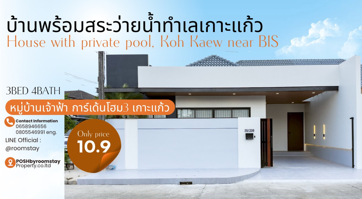 บ้านเดี่ยว พร้อมสระว่ายน้ำส่วนตัว โครงการเจ้าฟ้าการ์เด้นโฮม 3 – เกาะแก้ว ยกระดับการใช้ชีวิต ให้ทุกวันเหมือนได้พักผ่อนในรีสอร์ทส่วนตัว • ขนาดที่ดิน 62.4 ตร.วา • 3 ห้องนอน 4 ห้องน้ำ • สระว่ายน้ำส่วนตัว พื้นที่กว้าง โปร่ง โล่ง ตอบโจทย์การอยู่อาศัยของทั้งครอบครัว เหมาะทั้งอยู่อาศัยระยะยาว และบ้านพักตากอากาศ บรรยากาศเงียบสงบ เป็นส่วนตัว ถนนภายในโครงการกว้าง ไม่แออัด ทำเลศักยภาพ เกาะแก้ว ติดถนนเส้นหลัก เดินทางสะดวก เพียง 2 นาทีถึง British International School และ Boat Lagoon ใกล้ Robinson Lifestyle, อนุสาวรีย์, IKEA Bypass ┏━━━━━━━━━━━━━━━━━━┓ Offer a selling price 10,900,000.- ┗━━━━━━━━━━━━━━━━━━┛ Detached House with Private Swimming Pool Chaofa Garden Home 3 – Koh Kaew Elevate your lifestyle Feel like you’re on a private resort getaway every day • Land size: 62.4 sq.wah (249.6sq.m.) • 3 bedrooms, 4 bathrooms • Private swimming pool Spacious, airy, and comfortable Perfect for family living Ideal for both long-term residence and a holiday home Peaceful and private atmosphere Wide internal roads, not crowded 📍 Prime location in Koh Kaew On the main road, easy access Only 2 minutes to British International School and Boat Lagoon Close to Robinson Lifestyle, Monument area, and IKEA Bypass ⚫️ #บริษัทพอชบายรูมสเตย์พร็อพเพอร์ตี้ 🕳️ บริการเช็คเครดิต • คำนวณความสามารถในการกู้ • คำนวณอัตราผ่อนแต่ละเดือน 🕳️ We excel in sales and adeptly manage the trading operations for international clientele ➖➖➖➖➖➖➖➖➖➖➖➖➖➖➖➖➖ ☎️ More information, Please do not hesitate to contact us คลิกเพื่อดูเบอร์โทรติดต่อ คุณแนน คลิกเพื่อดูเบอร์โทรติดต่อ K.Ping (eng.) Line: @roomstay สอบถามข้อมูลทาง LINE สะดวกกว่าค่ะมีแอดมินดูแล https://lin.ee/aLaoTiw [ POSHBYROOMSTAYPROPERTY.CO.,LTD ] 📌 ชมรีวิวบ้านสวยๆได้ทาง https://www.tiktok.com/@poshbyroomstay?_t=8kTog2ffG59&_r=1