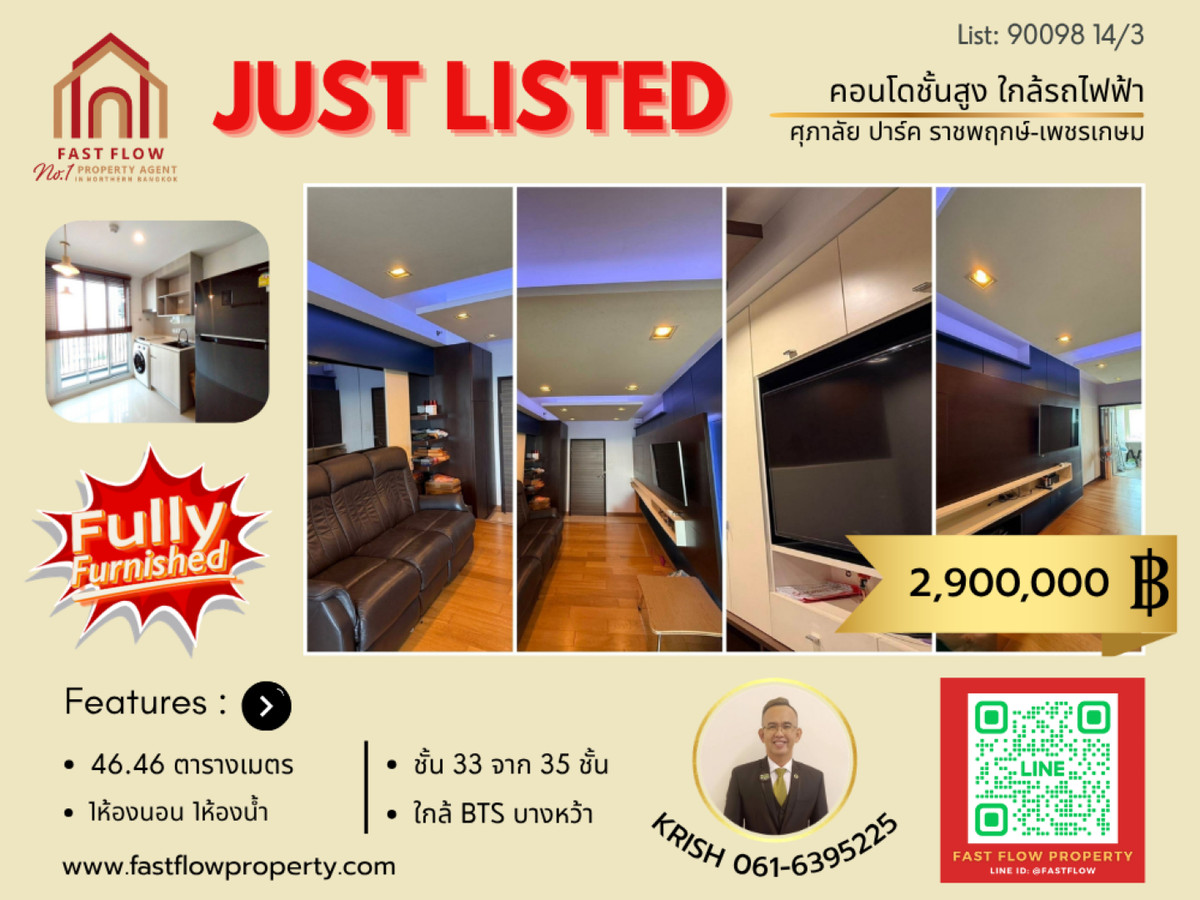 ขาย ห้องชั้นสูง ชั้น 33 ทิศใต้ วิวตึกสูง ไม่มีตึกอื่นบัง ตกแต่งพร้อมอยู่ fully furnished ศุภาลัย ปาร์ค ราชพฤกษ์-เพชรเกษม KIT สนใจติดต่อ เอเจ้นท์กฤช ณฐนน คลิกเพื่อดูเบอร์โทรติดต่อ Line id: agent_krish1412 Listing no : 90098 Room Detail: - ขายห้องชุด โครงการ ศุภาลัย ปาร์ค ราชพฤกษ์-เพชรเกษม - ห้องอยู่ชั้น 33 จากทั้งหมด 35 ชั้น - วิวไม่บล็อก วิวเมือง ฝั่งสาทร และรถไฟฟ้า - พื้นที่ใช้สอย 46.46 ตารางเมตร - ระเบียงหันทิศใต้ รับลม อากาศถ่ายเทสะดวก - 1 ห้องนอน 1 ห้องน้ำ - พื้นที่ครัวแยกเป็นสัดส่วน พร้อมเตาไฟฟ้าและเครื่องดูดควัน - สิทธิ์จอดรถ 1 คัน - บิวท์อินเฟอร์นิเจอร์อย่างดีทั้งห้อง - ขายพร้อมเฟอร์นิเจอร์ เครื่องใช้ไฟฟ้า ทีวี 2 เครื่อง, โซฟานวมปรับไฟฟ้า ,ตู้เย็น, เตาไฟฟ้า ,เครื่องดูดควัน ,เครื่องทำน้ำอุ่นและเครื่องปรับอากาศ 2 เครื่อง - ห้องสภาพดี สวย พร้อมอยู่ Project and Facilities: - โครงการ ศุภาลัย ปาร์ค ราชพฤกษ์ - เพชรเกษม พัฒนาโดยบริษัท ศุภาลัย จำกัด (มหาชน) - มีสระว่ายน้ำ / ฟิตเนส/ ซาวน่า - ค่าส่วนกลาง 35 บาทต่อตารางเมตร ต่อเดือน - CCTV และ รปภ. 24 ชั่วโมง - ลิฟท์ใช้ระบบคีย์การ์ดแยกชั้น สถานที่ใกล้เคียง: -รถไฟฟ้า BTS สถานีบางหว้า – มหาวิทยาลัยสยาม – ซีคอน บางแค, โลตัส บางแค, เดอะมอลล์ บางแค, เดอะมอลล์ ท่าพระ – ตลาดสดบางแค – โรงพยาบาลพญาไท 3, โรงพยาบาลเพชรเกษม 2 ตำแหน่งที่ตั้ง https://maps.app.goo.gl/mdPprmyqkfDncGG48 ราคา 2,900,000 บาท บริการช่วยเหลือจัดหาสินเชื่อธนาคารฟรี! สามารถนัดเข้าชมสถานที่จริงได้ทุกวัน สนใจราคาคุยกันได้ ติดต่อ : เอเจ้นท์กฤช ณฐนน คลิกเพื่อดูเบอร์โทรติดต่อ Line id: agent_krish1412 FB page: facebook.com/fastflowproperty www.fastflowproperty.com บริการรับฝากขายอสังหาริมทรัพย์ทุกประเภท ฟรีค่าโฆษณา