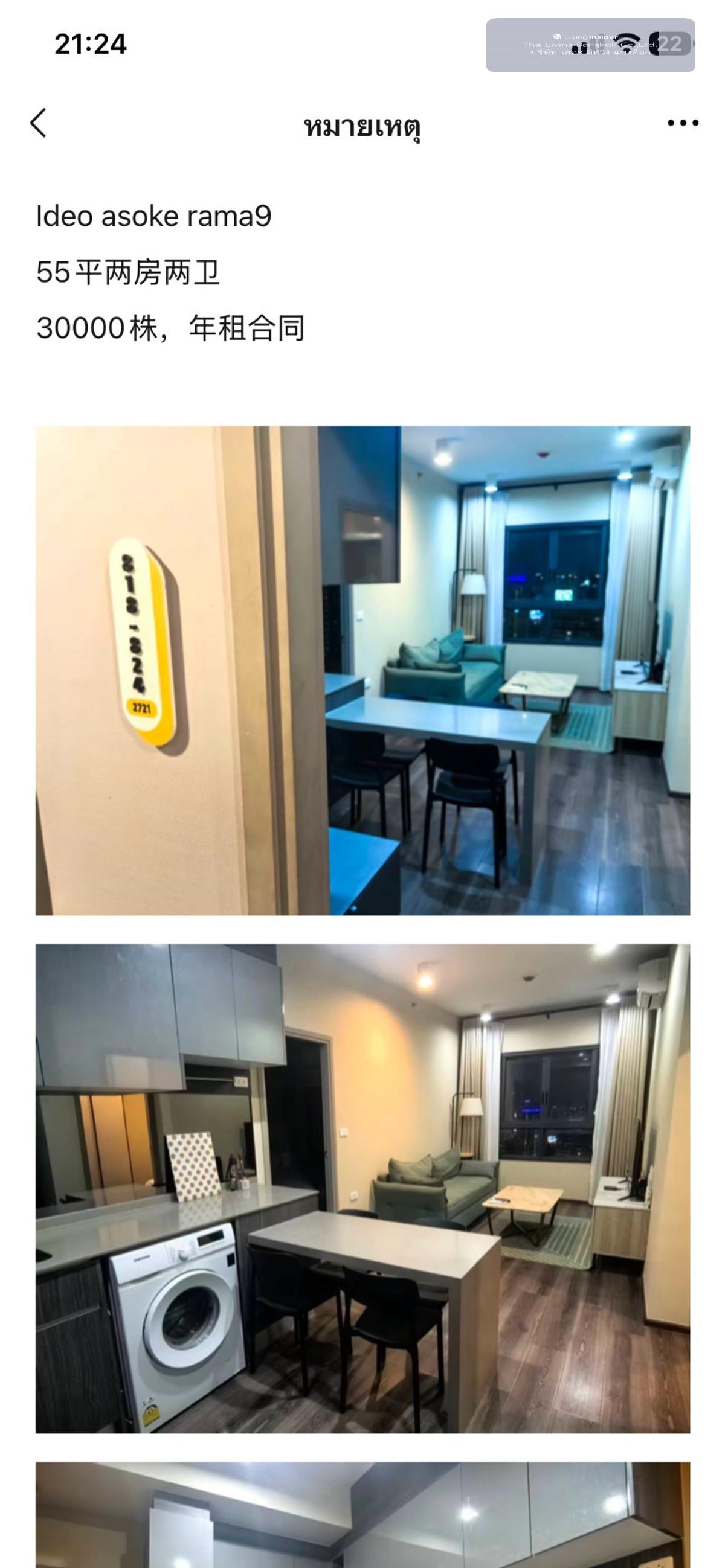 ✨Condo for Rent : Ideo Asoke Rama9 (AP-02) ( line : @condo91 ) คอนโด ให้เช่า : Ideo Asoke Rama9 (AP-02) ( line : @condo91 ) Type : 2 Bedroom 2 bathroom Size : 55 sqm. Floor : 27 Rental : 30,000 THB/month (เงินประกันสัญญา 2 เดือน + จ่ายล่วงหน้า 1 เดือน) Condition : minimum 1 year contract (2 months Deposit + 1 month Rental Advance) Contact : Mind (Amollada) Tel:  คลิกเพื่อดูเบอร์โทรติดต่อ Line ID : @condo91 can you add line me : https://lin.ee/F4yNzyT whatapp : คลิกเพื่อดูเบอร์โทรติดต่อ Email: คลิกเพื่อดูอีเมล www. thelivingbkk.com (บริษัท เดอะ ลิฟวิ่งแบงค็อก จำกัด) ที่ปรึกษาและบริการ ซื้อ-ขาย-เช่า อสังหาริมทรัพย์