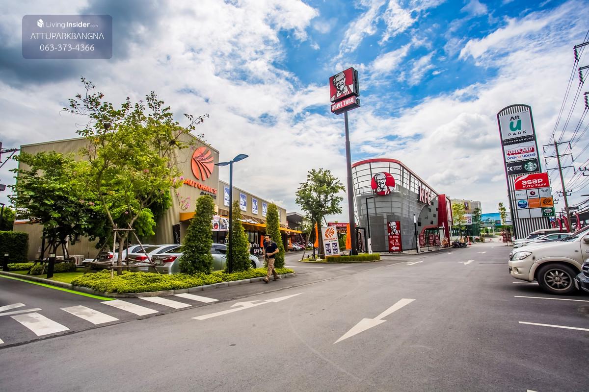 ภาพรวมโครงการ Att U Park Community Mall ย่านบางนา–ตราด กม. 12 ติดถนนใหญ่ เป็นศูนย์รวมของสินค้าและบริการที่ตอบโจทย์คนทุกไลฟ์สไตล์ ไม่ว่าจะเป็นครอบครัว กลุ่มเพื่อน และรวมถึงเป็นมิตรกับสัตว์เลี้ยง และมีซุปเปอร์มาเก็ตและร้านค้าที่เปิด 24 ชม. เช่น Foodland, Starbucks, KFC * ที่จอดรถมากกว่า 50 คัน (ฟรี! ไม่เสียค่าบริการ) * Pet Friendly พื้นที่เป็นมิตรกับสัตว์เลี้ยง * ฐานลูกค้าหลากหลาย ทั้งคนทำงานและที่พักอาศัย รายละเอียด * พื้นที่ขนาดเริ่มต้น 273-558 ตร.ม. * เพดานสูง 6 เมตร * สามารถทำคอร์ตพิคเคิลบอลไซส์มาตรฐานได้ประมาน 4-5 คอร์ต * ประกันพื้นที่ 4 เดือน * ประกันการตกแต่ง เริ่มต้น 20,000 บาท ได้คืนหลังเปิดร้าน 1 เดือน ทางเจ้าหน้าที่จะตรวจร้านและคืนเงิน * ประกันมิตเตอร์น้ำ เริ่มต้น 2,500 บาท * ประกันมิตเตอร์ไฟ เริ่มต้น 6,500 บาท