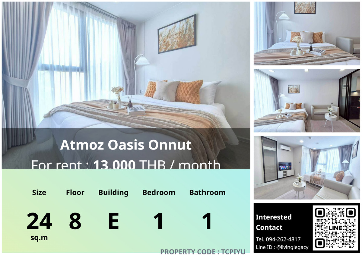 🏠 TCPIYU ให้เช่าคอนโด Atmoz Oasis Onnut 24 ตร.ม. ชั้น 8 ตึก E 1 นอน 1 น้ำ ✨ พร้อมอยู่ทันที! ห้องสวยแต่งครบ พร้อมเข้าอยู่ได้เลย! 🔍รายละเอียด - จำนวนห้องนอน: 1 - จำนวนห้องน้ำ: 1 - พื้นที่ใช้สอย (ตร.ม.): 24 - ชั้นที่: 8 - อาคาร: E 🌟 ไฮไลท์ห้องนี้! 🌟 🌟สิ่งอำนวยความสดวกต่างๆ - เครื่องปรับอากาศ - เฟอร์นิเจอร์ 📞 รีบจองด่วน! สอบถามรายละเอียดเพิ่มเติม ราคา 13000 บาท รหัสทรัพย์สิน: TCPIYU สนใจติดต่อ แอดไลน์ ID: @livinglegacy เฟสบุ๊ค: LivingLegacy WhatsApp: https://wa.me/ คลิกเพื่อดูเบอร์โทรติดต่อ สนใจห้องอื่นๆในโครงการคลิก : https://living-legacy.atrobot.asia/property-listing/660d41ee703e911b07a4c3fd #AtmozOasisOnnut #MarukaMachineryThailandCoLtdHEADOFFICE #BowmanIngredientsThailandCompanyLimited #CADSERVICECOLTDBangkokOffice #StMarksAustralianInternationalSchoolSrinakarinCampus #SpaOfficeSupplyCompanyLimited #SuraoBuengNongBonSchool #ZAZASukhumvit77Bangkok #EdudoActivitySchool #บริษัทปิยะณัฐสอนขับรถจำกัด #TheMasterBTSOnnutPattanakarn