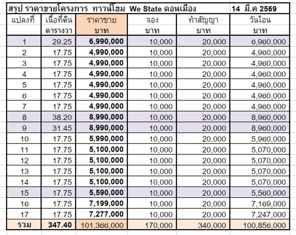 **จองเพียง 10,000 บาท** บ้านเปล่า เริ่ม 4.99 ล้าน จอง 10,000 บาท (17.75 ตารางวา) บ้านตัวอย่าง แต่งครบ แบบในอัลบัม/ คลิปนี้ 8.99 ล้าน จอง 10,000 บาท (31.45 ตารางวา) We State ดอนเมือง ซอยประชาอุทิศ 12 ต
