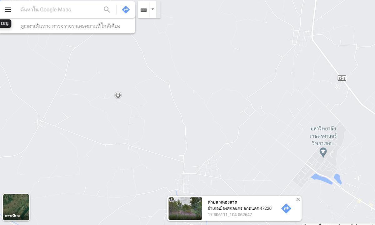 เจ้าของขายเอง ที่ดินเหมาะกับซื้อเก็บไว้ทำฟาร์ม สวน ที่ดินตำบล หนองลาด อำเภอเมืองสกลนคร สกลนคร ที่ดินติดกันตามภาพถ่ายดาวเทียม มีโฉนด 2 ใบ Location: 17°18'22.0"N 104°03'45.0"E สนใจเข