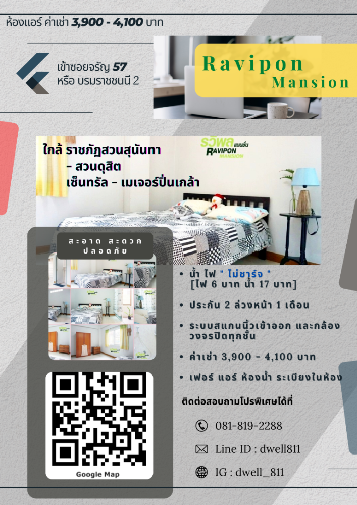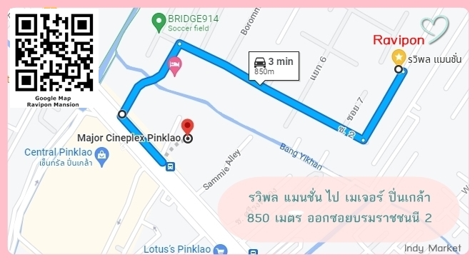 รวิพล แมนชั่น หลังเมเจอร์ ปิ่นเกล้า " ใหม่ สะอาด สะดวก ปลอดภัย" " แอร์ เฟอร์ ครบทุกห้อง เนตแรง" ค่าเช่า 3,900 - 4,300 บาทต่อเดือน (สัญญา 6 เดือน) ติดต่อ คลิกเพื่อดูเบอร์โทรติดต่อ , คลิกเพื่อดูเบอร์โทรติดต่อ หรือ line ID : @oksure (แจ้งว่าสอบถามหอ Ravipon Mansion ครับ) IG : dwell_811 แผนที่ https://goo.gl/maps/C47TsWE4qgq (หรือค้นหาใน Google พิมพ์ รวิพล แมนชั่น) รายละเอียดค่าใช้จ่าย + น้ำ คิดตามอัตราที่การประปาเรียกเก็บ + ไฟ คิดตามอัตราที่การไฟฟ้าเรียกเก็บ + ทำสัญญา วางค่าประกันห้อง 1 เดือน วางค่าประกันเฟอร์นิเจอร์และเครื่องใช้ไฟฟ้า 1 เดือน และชำระค่าเช่า ณ เดือนที่เข้าอยู่ 1 เดือน ____________________________________________________________________________ รายละเอียดห้องทุกห้อง 1. เครื่องปรับอากาศ 2. ตูุ้เสื้อผ้าขนาดใหญ่ 1 ใบ 3. ชั้นวางทีวี 4. เตียงพร้อมที่นอนขนาด 5 ฟุต 5. กระจกเงา 2 บาน 6. ห้องน้ำ และระเบียงในตัว สิ่งอำนวยความสะดวกในแมนชั่น * มินิมาร์ต * ตู้น้ำ * เครื่องซักผ้า * กล้องวงจรปิด 12 ตัว * กุญแจรั้ว * คีย์การ์ด * ที่จอดรถเมอร์เตอร์ไซด์ * กริ่งสัญญาณเตือนภัย * ถังดับเพลิง * ไฟฉุกเฉิน การเดินทาง รวิพล แมนชั่น เข้าออกได้ 2 ทาง (ซอยบรมราชชนนี 2 และ ซอยจรัญสนิทวงศ์ 57) พิกัด GPS: 13.780058, 100.481732 (หรือ Google Search ว่า รวิพล แมนชั่น) * มาจากถนนบรมราชชนนี - เส้นเมเจอร์ – เซ็นทรัล ปิ่นเกล้า - ซอย บรมราชชนนี 2 วิ่งถนนบรมราชชนนี มุ่งหน้าสี่แยกปิ่นเกล้า ก่อนถึงเมเจอร์ ปิ่นเกล้า ชิดซ้ายเข้าซอยบรมราชชนนี 2 วิ่งตรงมา ด้านขวาจะเป็นสมพงษ์ คอร์ตแบต แล้วจะเจอ 3 แยก เลี้ยวขวาเข้าซอย 2 ตรงมาจะผ่านป้อมยาม 2 ป้อม สุดทางเจอทางบังคับเลี้ยวซ้าย ตรงไปอีก 100 เมตร จะเห็น รวิพล แมนชั่น ตึกสีขาว 5 ชั้น อยู่ทางด้านซ้ายมือ รถประจำทางที่ผ่าน : 123 / 146 / 542 / 170 / 183 / 40 / 66 / 507 / 516 / 57 / 127 / 124 * มาจากถนนจรัญสนิทวงศ์ - ซอยจรัญสนิทวงส์ 57 (วัดรวก) วิ่งถนนจรัญสนิทวงศ์ มุ่งหน้าสี่แยกบางพลัด ชิดซ้ายเข้าซอยจรัญสนิทวงศ์ 57 (วัดรวก – หน้าซอยเป็นร้า Pizza Hut) ตรงเข้ามาเลี้ยวซ้ายเข้า ซอยจรัญสนิทวงศ์ 57 แยก 3 [มีร้าน 7-11 ตรงแยก] ตรงเข้ามาแล้วเลี้ยวซ้ายเข้า ซอยจรัญสนิทวงศ์ 57 แยก 3 – 7 เมื่อตรงเข้ามาจนเจอสามแยก [57-3-7-2] ให้เลี้ยวขวาอีกครั้ง ตรงต่อไปจนเจอสามแยกให้เลี้ยวซ้าย จากนั้นขับตรงไปจะเห็น รวิพล แมนชั่น เป็นตึกสีขาว 5 ชั้น อยู่ทางด้านขวามือ + รถโดยสาร ประจำทางที่ผ่าน : 28 / 56 / 107 / 108 / 128 / 175 / 203 / 505 ใกล้กับ ใกล้เมเจอร์ปิ่นเกล้า, ใกล้เซ็นทรัลปิ่นเกล้า, ใกล้สายใต้ใหม่, ใกล้โรงพยาบาล เจ้าพระยา, ใกล้โลตัส ปิ่นเกล้า, ใกล้โลตัส บางพลัด, ใกล้ราชภัฎสวนสุนันทา, ใกล้ราชภัฎสวนดุสิต, ใกล้โรงเรียน ทิวไผ่งาม, ใกล้สี่แยกปิ่นเกล้า, ใกล้สี่แยกบางพลัด, ใกล้โรงพยาบาลหูตาคอจมูก, โรงพยาบาล ศิริราช, ใกล้ห้าง ตั้