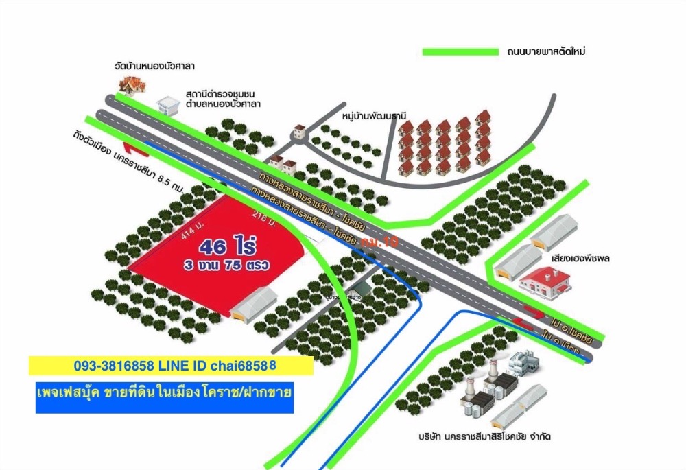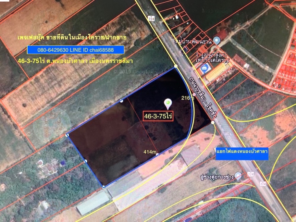 ที่ดินเปล่าติดถนนราชสีมา-โชคชัย กม.10 ขาเข้าเมืองโคราช เนื้อที่ 46-3-75ไร่ ที่ดินหน้ากว้าง 216เมตร ลึก 395เมตรใกล้เขตอุตสาหกรรมสุรนารี ทำเลเหมาะพัฒนาเป็น โกดังให้เช่า หรือ โรงงานอุตสาหกรรม อื่นๆ ที่ดิ
