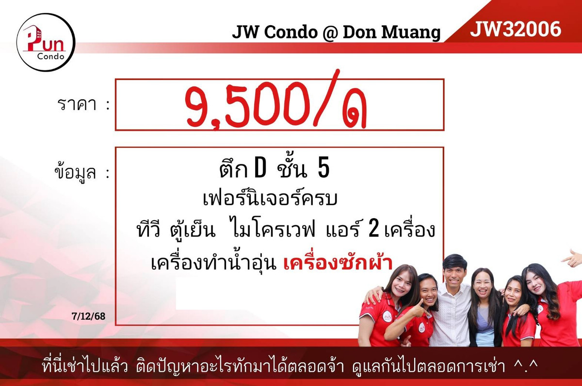 𝙅𝙒 𝙘𝙤𝙣𝙙𝙤เช่า | ตรงข้ามดอนเมือง เพียง 300 ม. 🚶เดินข้ามสะพานลอยถึงสนามบินจริง! 💥ห้องใหญ่ 32 ตร.ม แยกโซนชัด อยู่สบาย ❄️ พร้อมแอร์ 2 เครื่อง เย็นฉ่ำทั่วห้อง 🚗 ทำเลดี ติดถนนสรงประภา เดินทางง่าย 🥦 ค่าเช่า 9,500฿/เดือน 🥦 ตึกD ชั้น5 : [ Jw32006 ] 🛋 เฟอร์นิเจอร์ เครื่องใช้ไฟฟ้า ตามภาพ 💰แรกเข้าชำระ -ค่าเช่าล่วงหน้า 1 เดือน -เงินประกัน 2 เดือน *ค่าเช่ารวมค่าส่วนกลางแล้ว ——————————————————————— 🔍 Pun Condo ผู้ช่วยส่วนตัว เช่า คอนโดย่านรังสิต 🌟 มีห้องหลายแบบ หลายตึก #ทุกโครงการย่านรังสิต > อยากดูห้องเพิ่มเติม ทักมาได้นะคะ 💬 📲 Line: @pun-condo (มี @) ☎️ คลิกเพื่อดูเบอร์โทรติดต่อ ——————————————————————— #และทุกคอนโดย่านรังสิต #ให้เช่าjwcondoดอนเมือง #คอนโดใกล้ดอนเมือง #คอนโดใกล้วิทยาลัยเทคนิคดอนเมือง #JWcondo #คอนโดใกล้สนามบินดอนเมือง #ติดถนนสรงประภา #คอนโดย่านดอนเมือง #Puncondo #ปันคอนโด #agent #รับฝากคอนโดรังสิต #ลงทุน #นายหน้าอสังหา
