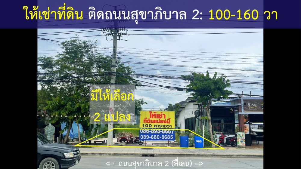 *** ให้เช่าที่ดิน เหมาะทำร้านค้า ติดถนนสุขาภิบาล 2 (อ่อนนุช-ลาดกระบัง) แขวงดอกไม้ เขตประเวศ กทม. พื้นที่อยู่ระหว่างถนนสุขาภิบาล 2 ซอย 23 และซอย 25 จำนวน 2 แปลง ขนาด 100, 160 ตารางวา ที่ดินเป็นทรงสี่เหลี่ยม ติดหน้าถนนสุขาภิบาล 2 เป็นถนนกว้างสี่เลนพร้อมไหล่ทาง เหมาะทำร้านค้า ในที่ดินมีร้านค้าขนาดใหญ่ที่เปิดทำการอยู่แล้วมากมายตามภาพในโพส พร้อมที่จอดรถขนาด 120 ตารางวา และทางเชื่อมจากถนนเพื่อขับขึ้นลานจอด สนใจเช่าที่ดิน โทร. คลิกเพื่อดูเบอร์โทรติดต่อ *** ที่ดินมีให้เลือก 2 แปลง คือ * แปลงที่ 1: ขนาด 100 ตารางวา ติดถนนสุขาภิบาล 2 ค่าเช่าเดือนละ 30,000 บาท (ค่าเช่าเฉลี่ยวาละ 300 บาท) ติดถนนสุขาภิบาล 2 ขับไปอีก 20 เมตรเพื่อขึ้นลานจอดรถขนาด 120 ตารางวา * แปลงที่ 2: ขนาด 160 ตารางวา ติดถนนซอยสุขาภิบาล 2 ค่าเช่าเดือนละ 32,000 บาท (ค่าเช่าเฉลี่ยวาละ 200 บาท) อยู่ในถนนซอยสุขาภิบาล 2 ถนนซอยกว้าง ขับเข้าจอดรถในที่ดินได้อย่างสะดวก * ที่จอดรถ: ขนาด 120 ตารางวา ใช้ร่วมกันในหมู่ร้านค้าที่ตั้งอยู่ใกล้เคียงกับที่จอดรถ *** สัญญาเช่า: ผู้เช่าปลูกสร้างร้านค้าบนที่ดินเปล่าเอง ต่อสัญญาได้ทุก 3 ปี ชำระเงินเทียบเท่าค่าเช่า 4 เดือนเพื่อเข้าใช้ที่ดิน (ค่าเช่าล่วงหน้า 1 เดือนและค่ามัดจำความเสียหาย 3 เดือน) สามารถขอสัญญาเช่าที่สั้นหรือยาวกว่า 3 ปีได้ตามตกลง *** ที่ดินแปลงนี้อยู่ในเส้นทางสัญจรหลัก เดินทางไปมาสะดวกระหว่างถนนอ่อนนุช ถนนลาดกระบัง ทางหลวงกาญนาภิเศก (อ่อนนุช-บางนา) ถนนบางนา-ตราด ทางด่วนมอเตอร์เวย์ (พระราม 9 – ลาดกระบัง) ซอยกิ่งแก้ว 25/1 ถนนกิ่งแก้ว และทางหลวงกาญนาภิเศก (บางปะอิน-บางนา) *** ร้านค้าที่อยู่ในใกล้ที่ดินแปลงนี้ ได้แก่ ต้นหว้าคาเฟ่, ร้านอาหารโต๊ะกลม, สถานตรวจสภาพรถยนต์แอลพี, ร้านซักผ้าอัตโนมัติ Wash Express, ตั้งย่งเฮงวัสดุก่อสร้าง, แบมแบมหมูจุ่ม, สระว่ายน้ำ Little Whale *** ร้านค้าในละแวกใกล้เคียง ได้แก่ 7-11, Family Mart, Big C, Lotus's (Tesco Lotus Express), Tops Supermarket, Cafe Amazon, Kerry Express, H-Cape Biz Space *** หมู่บ้านในละแวกใกล้เคียง ได้แก่ วิลล่านครินทร์ อ่อนนุช-วงแหวน, Plex อ่อนนุช-วงแหวน, Casa Grand อ่อนนุช-วงแหวน, ภัทรา อ่อนนุช-วงแหวน, H-Cape Serene บางนา-สุขาภิบาล 2, มัณฑนา บางนา-วงแหวน, ภัสสร บางนา-วงแหวน, กฤษฎานคร วงแหวน-อ่อนนุช *** สถานที่ใกล้เคียงที่ดินแปลงนี้ ได้แก่ ตลาดโรงถ่าน, ร้านคาเฟ่ ณ เชียงใหม่, โครงการป่าในกรุง ปตท, H-Cape Office Space, รพ.สิรินธร, ห้างโรบินสันลาดกระบัง, ห้างพาซิโอลาดกระบัง, แม็คโครลาดกระบัง, นิคมอุตสาหกรรมเจมโมโพลิส, รพ.จุฬารัตน์ 9 สนใจเช่าที่ดิน โทร. คลิกเพื่อดูเบอร์โทรติดต่อ