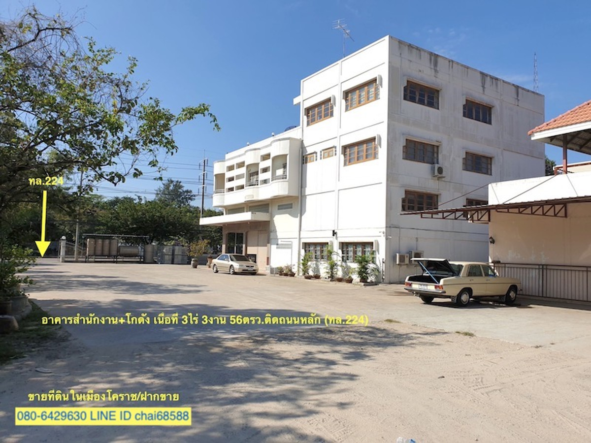ขายที่ดินพร้อมสิ่งปลูกสร้าง สำนักงาน+โกดัง เนื้อที่ 3ไร่ 3งาน 56ตร.ว หน้ากว้าง 40เมตร ลึก 100เมตร ด้านหน้าติดถนนราชสีมา-โชคชัย (224) ด้านหลังติดคลอง สำนักงานพร้อมโกดังตั้งอยู่ในเมืองโคราชใกล้คูเมืองใก