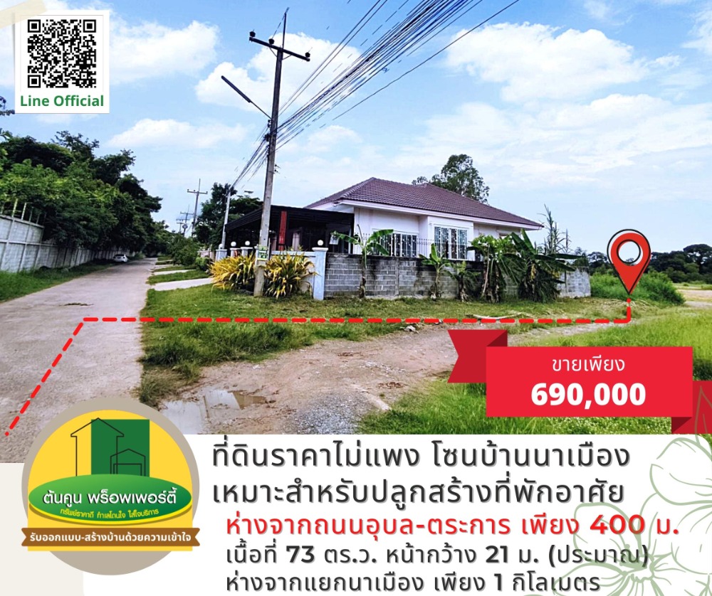 ขายที่ดินไม่แพง ขนาด 73 ตร.ว. เหมาะสำหรับสร้างบ้าน โซนบ้านนาเมือง เมืองอุบลฯ [รหัส TK-1944-B160] จุดเด่น: + ที่ดินเนื้อที่ 73 ตร.ว. หน้ากว้าง 21 x 12 เมตร (โดยประมาณ) + เหมาะสำหรับปลูกสร้างบ้าน เดินทางสะดวก + มีเพื่อนบ้านหลายหลัง อยู่ใกล้ถนนใหญ่ + ห่างจากถนนอุบล - ตระการ เพียง 400 เมตร + ห่างจากแยกนาเมือง เพียง 1 กิโลเมตร สถานที่ใกล้เคียง : โรงเรียนบ้านนาเมือง, สนามบิน, กองบิน 21, รพ. 50 พรรษา ขายเพียง 690,000 บาท 📢 นัดดูที่ดิน/สอบถามข้อมูลเพิ่มเติม ทักแชทหรือโทรมาคุยได้ค่ะ -> Line Official: http://line.me/R/ti/p/@rjg7947j -------------------------------- ติดต่อสอบถามเพิ่มเติม ☎️: คลิกเพื่อดูเบอร์โทรติดต่อ (โบ ต้นคูน) Line: @ubonproperty ☎️: คลิกเพื่อดูเบอร์โทรติดต่อ (ต้นคูน) -------------------------------- ติดตามทรัพย์เพิ่มเติมทางเพจ https://www.facebook.com/UbonRatchathaniProperty/ ต้นคูน พร็อพเพอร์ตี้🌳 ฝากขาย ฝากเช่า ขายฝาก ขายบ้าน/ที่ดินในอุบลราชธานี ให้คำปรึกษาด้านอสังหาริมทรัพย์ #ต้นคูนพร็อพเพอร์ตี้ #รับสร้างบ้าน #บ้านและที่ดินอุบลByต้นคูนพร็อพเพอร์ตี้ #บ้านอุบล #ที่ดินอุบล #นายหน้าอุบล #บ้านมือสอง