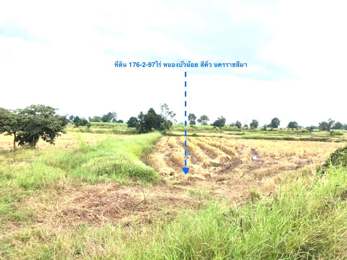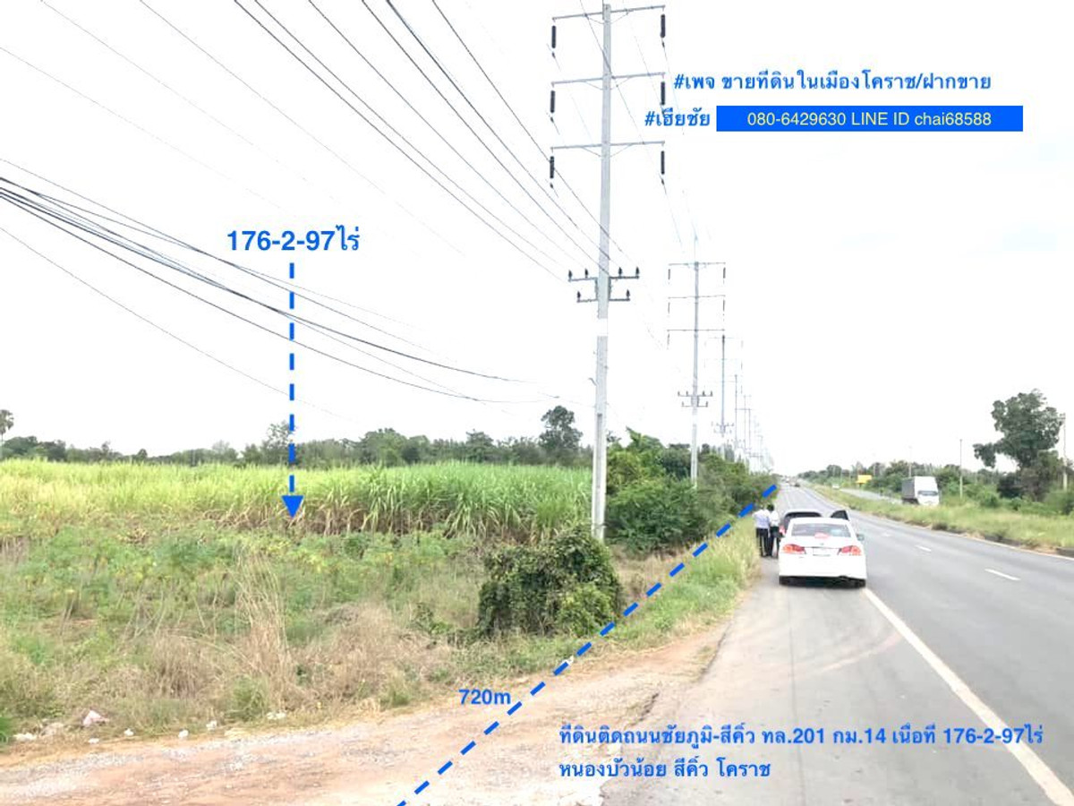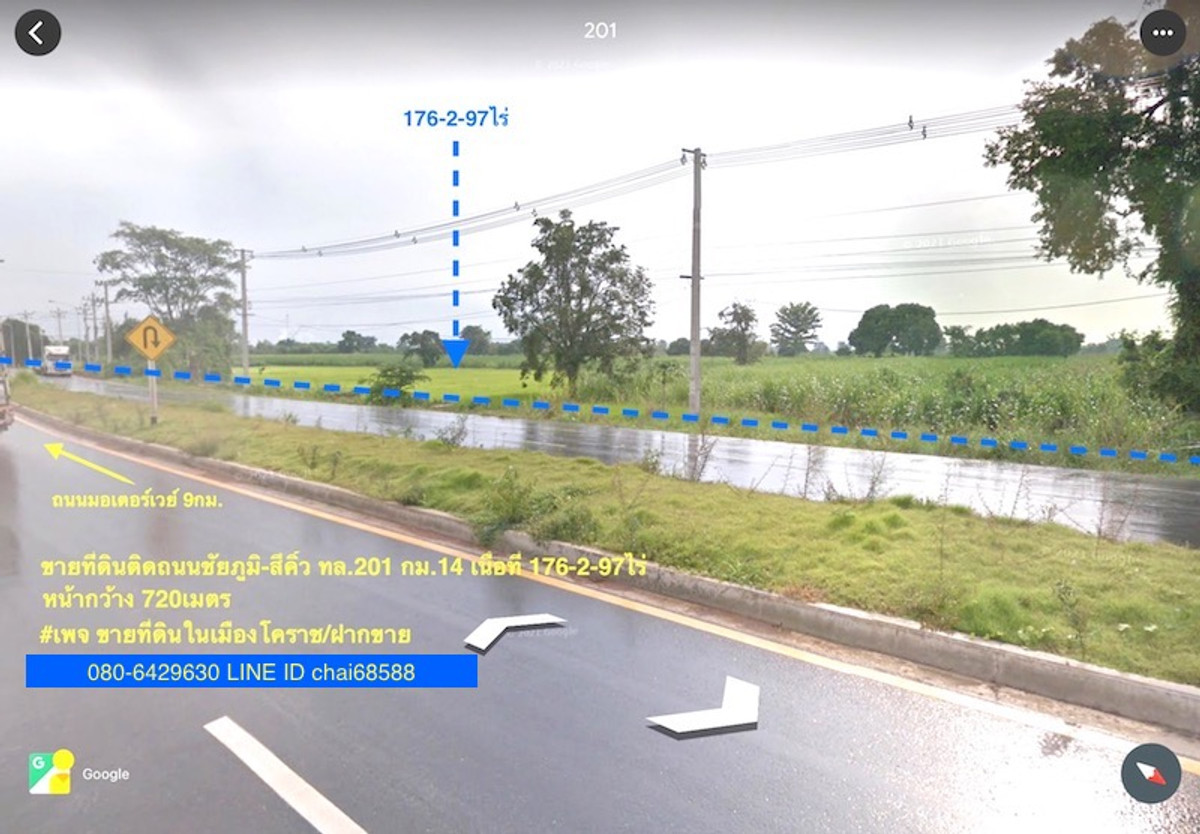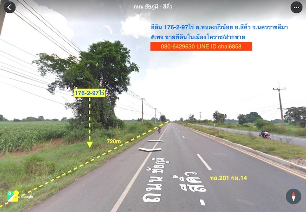 Land for sale on Chaiyaphum-Sikhio Road (Thor Lor. 201) km. 14 9 km. away from the motorway, land area 176-2-97 rai, land width 720 meters, depth 650 meters, Nong Bua Noi Subdistrict, Sikhio District,