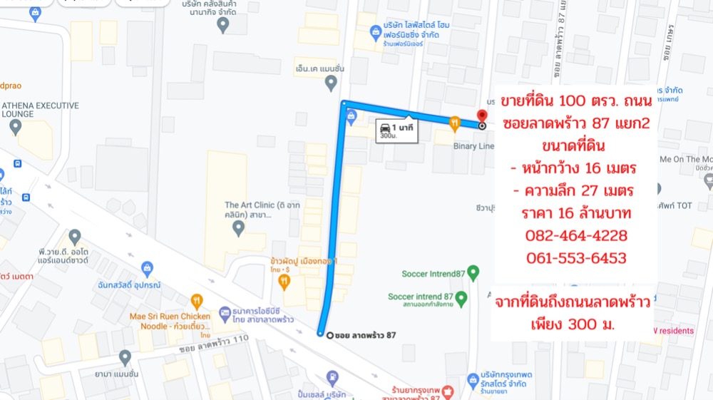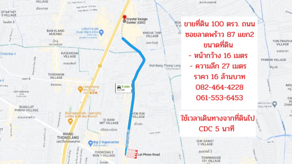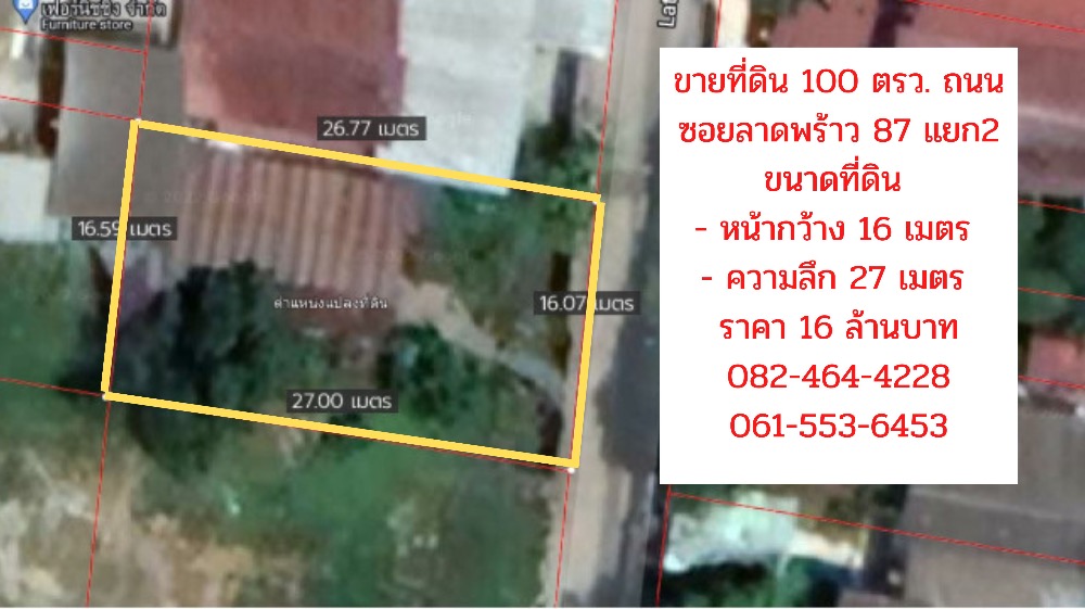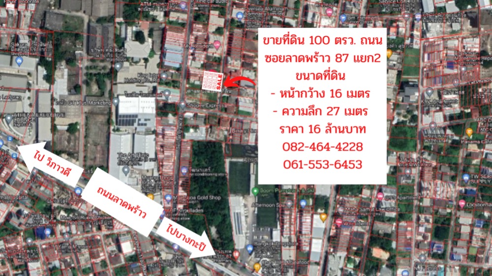 Land for sale 100 square wa. Road Soi Ladprao 87 intersection 2, very good location from the land to Ladprao Road, 200 meters away from the yellow train. Ladprao 83 station, only 700 m -------------------------------Land size - Width 16 meters - Depth 27 meters price 16 million baht Interested contact Phueng Contact number pound Contact number ------------------------------------------ nearby places - Big C Ladprao (0.6 km.) - Imperial Ladprao (0.6 km.) - Ladprao Hospital (0.9 km.) - Soi Ladprao 122 (Mahadthai 1) (0.9 km.) - Town in Town (1.5 km.)- Bodindecha 3 School (1.6 km.) - CDC ( 5 km. )