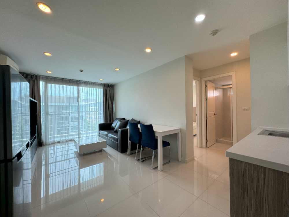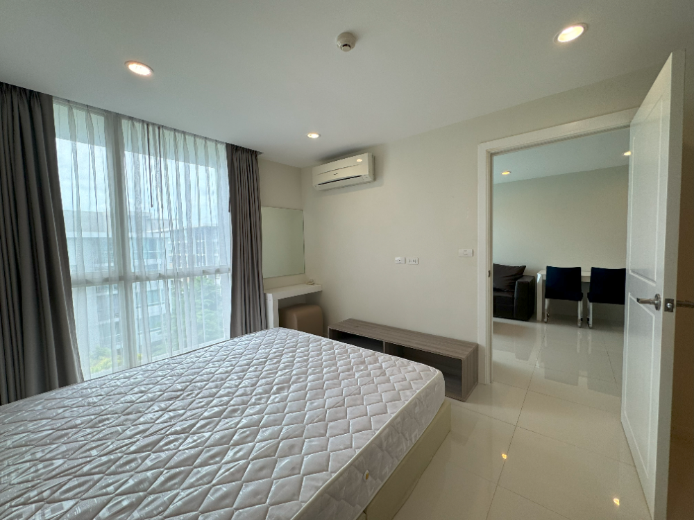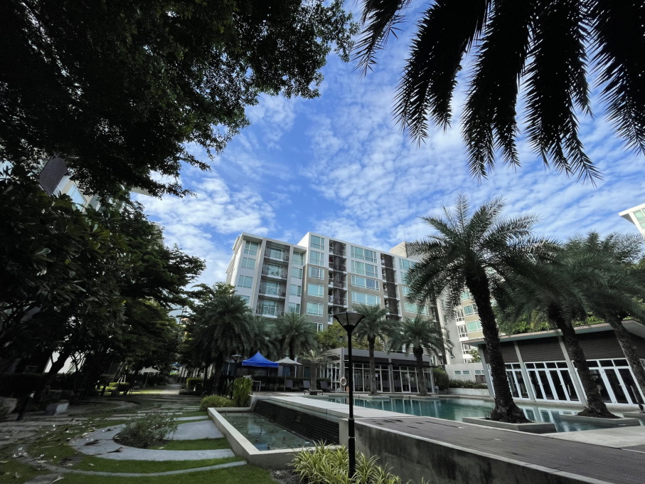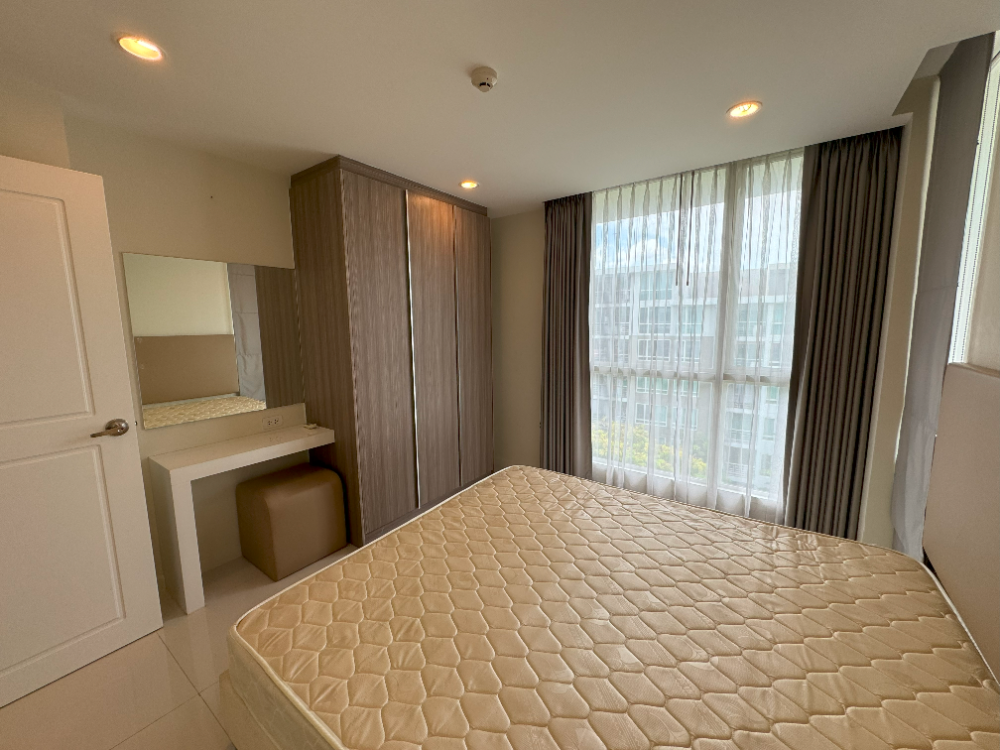Condo for rent, 2 bedrooms, 2 bathrooms, 1 living room , garden view, located on the 7th floor, corner room, away from elevators and trash 2 months deposit, at least 1 year contract with 1 parking card, can park in the basement of the building. or a parking building near seacon square Paradise Park Train Night Market is convenient to travel. Near the yellow line, Suan Luang Rama IX Station