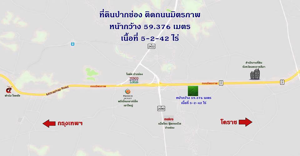 🌳Location: Takhian Thong, Khanong Phra Subdistrict, Pak Chong District, Nakhon Ratchasima 30130 🔥Selling price 11 million baht / rai (27,500 baht per square wah)** transfer fee - half of tax (interested in bargaining) 🔎Details: • Total area of 5-2-42 rai • Land on the main road. Easy to travel • The land is next to Krung Kritha Road. Near the community, shops, gas stations • The width of the road is 60 meters, the back is 66 meters • The land is about 142 meters deep and 134 meters • Near the turn to Khao Yai • Only 2 km. away from Lotus Pak Chong Premium Let Khao Yai • 2 km. away from Makro Pak Chong • away from Pak Chong-Khao Yai intersection (Thanarat Road) only 1 km. away from Chokchai Farm, only 10 km (10 minutes) • Not far from the high-speed train station • Near villages, shops, schools, hospitals, convenience stores, supermarkets, fresh markets, hotels, gas stations, and others • Suitable for building business Commercial buildings, restaurants, tourist attractions, hotels, resorts, residential houses, and others. 📍Land coordinates: https://goo.gl/maps/6GPenedi16R2 Interested contact..👇👇 🏡 Properties on Request by COCO and CHA 📞Phone no.: 080-946- 3699 📧 Email: Contact email🌐 FB: https://bit.ly/2DJwnkA 📱Line ID: @coconcha