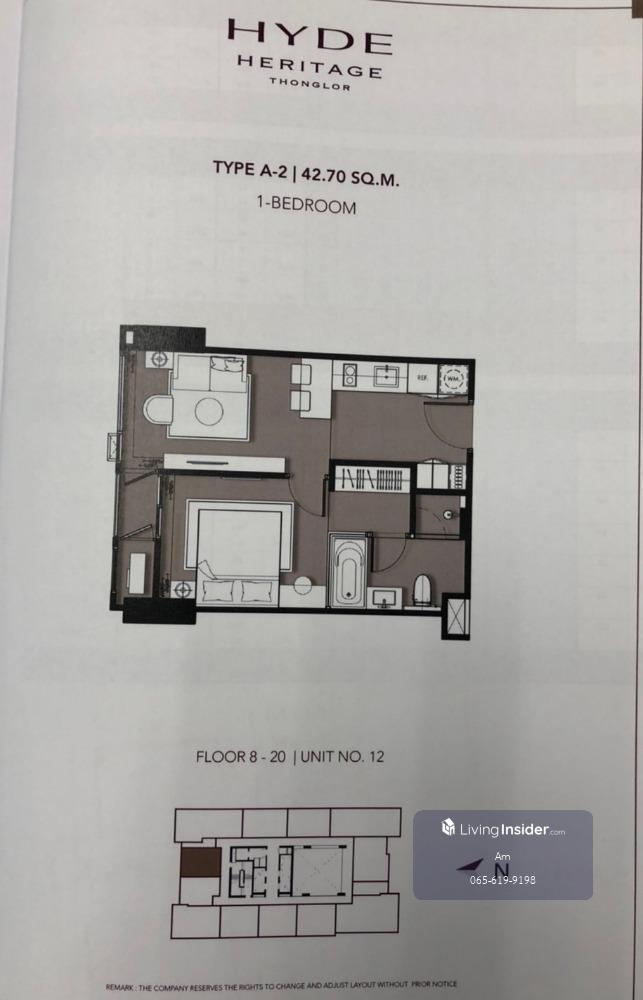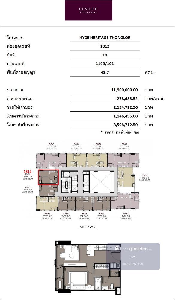 Hyde Heritage Thonglor: 1bed 1bath 42.7sqm Type A-2 Sale: 11,900,000 before transfer High Floor Facing North Call/Line: Am Contact number https://line.me/ti/p/_MXfrDHcUp Whatsapp/Wechat: Contact numbe