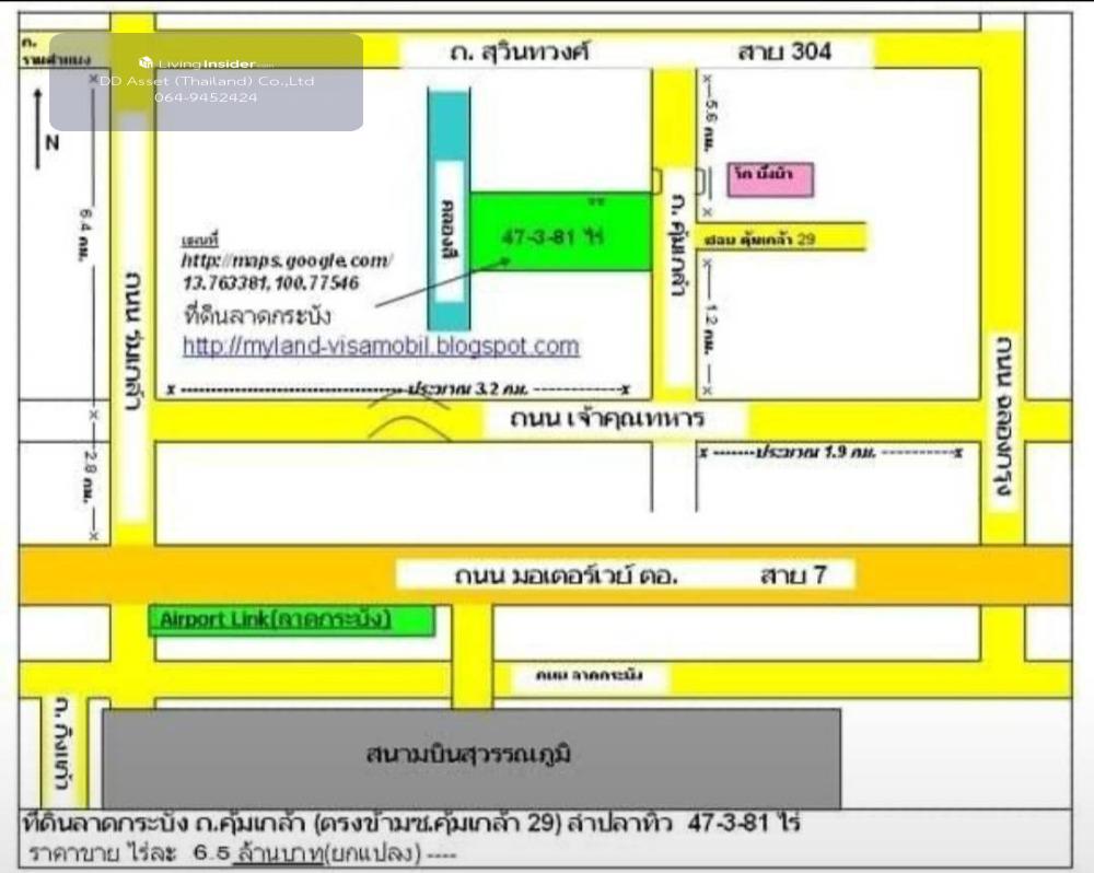 Land for sale, Lat Krabang, Khum Klao Road, Lam Pla Tiw, near Suvarnabhumi Airport, 6.5 million baht per rai. . Selling price: 311,691,250 baht (Selling 6.5 million baht per rai / 16,250 baht per wa) ** All transfer fees at the Department of Lands, half each Area: 47-3-81 Rai (47 rai 3 ngan 81 wah) White area diagonally green Its likely that the front half will be solid green. The back half will be a green pattern. Wait for the official announcement again. Width 96 meters, depth about 800 meters ___________________ Location: The land is opposite Soi Khum Klao 29, Lamplatiew Subdistrict, Ladkrabang District, Bangkok 10520 ___________________ Contact for more information Make an appointment to see the house at office: Contact number (Khun Dai) (B) View more properties www.ddasset.co.th Like the page https://www.facebook.com/ddassetthailand/ DD Asset (Thailand) Co., Ltd. For sale, consignment, mortgage, rent, house, land Condo real estate of all kinds #ddasset #house for sale #condo #1st hand house #2nd hand house #house for rent #condo for rent #Second hand house