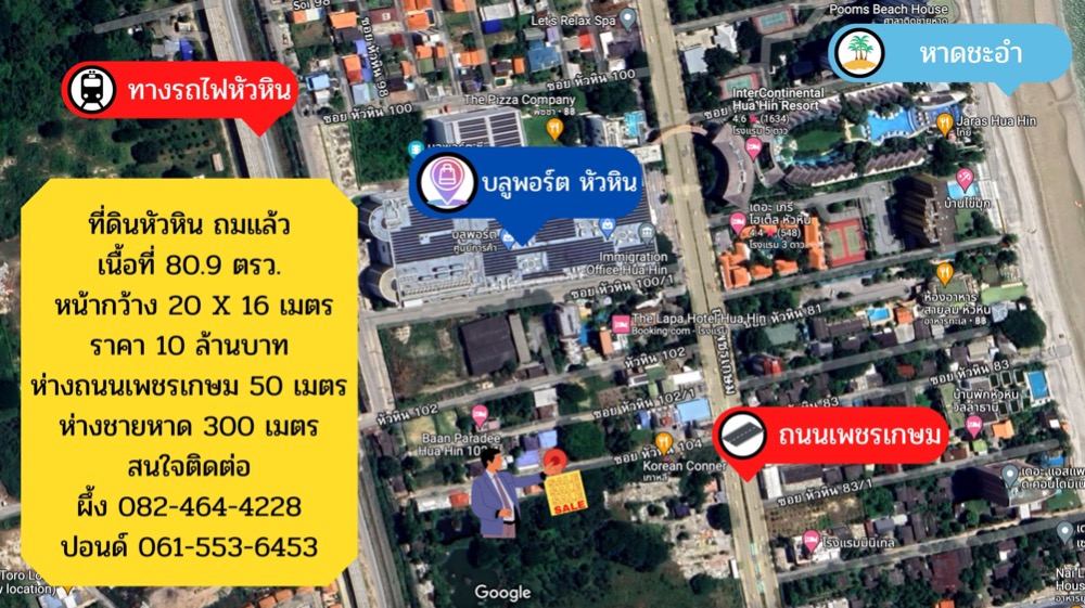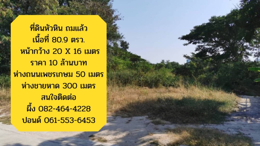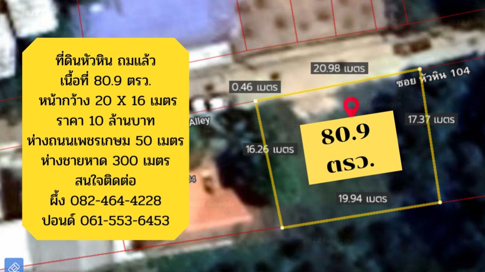 Land for sale in Hua Hin, reclamation, near Bluport Hua Hin, beautiful plot, wide front - Area 80.9 sq m. - width 20 meters - Depth 16 meters - Filled - Convert a beautiful rectangle - Near Petchkasem Road Price 10 million baht contact Bee Contact number Pound Contact number Nearby landmarks - Bluport Hua Hin - Hua Hin Railway Station - Market Village Hua Hin - Cicada Market - Hua Hin Beach - Khao Takiab Temple