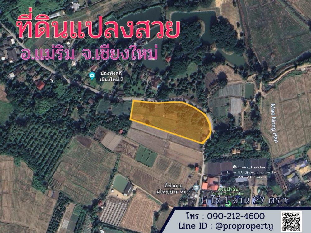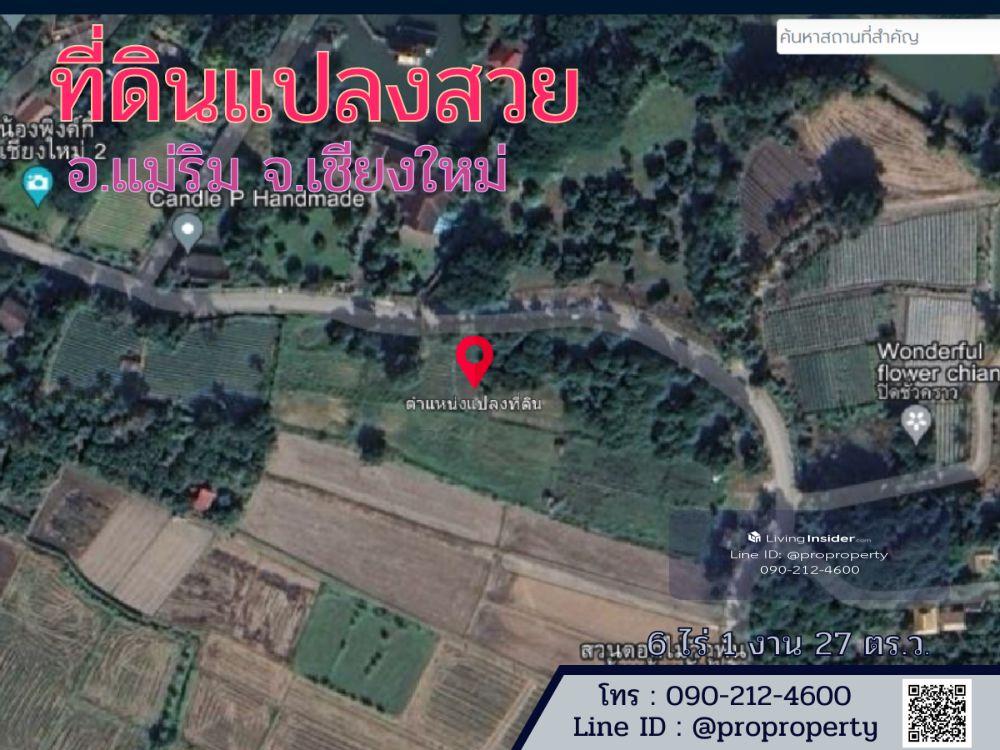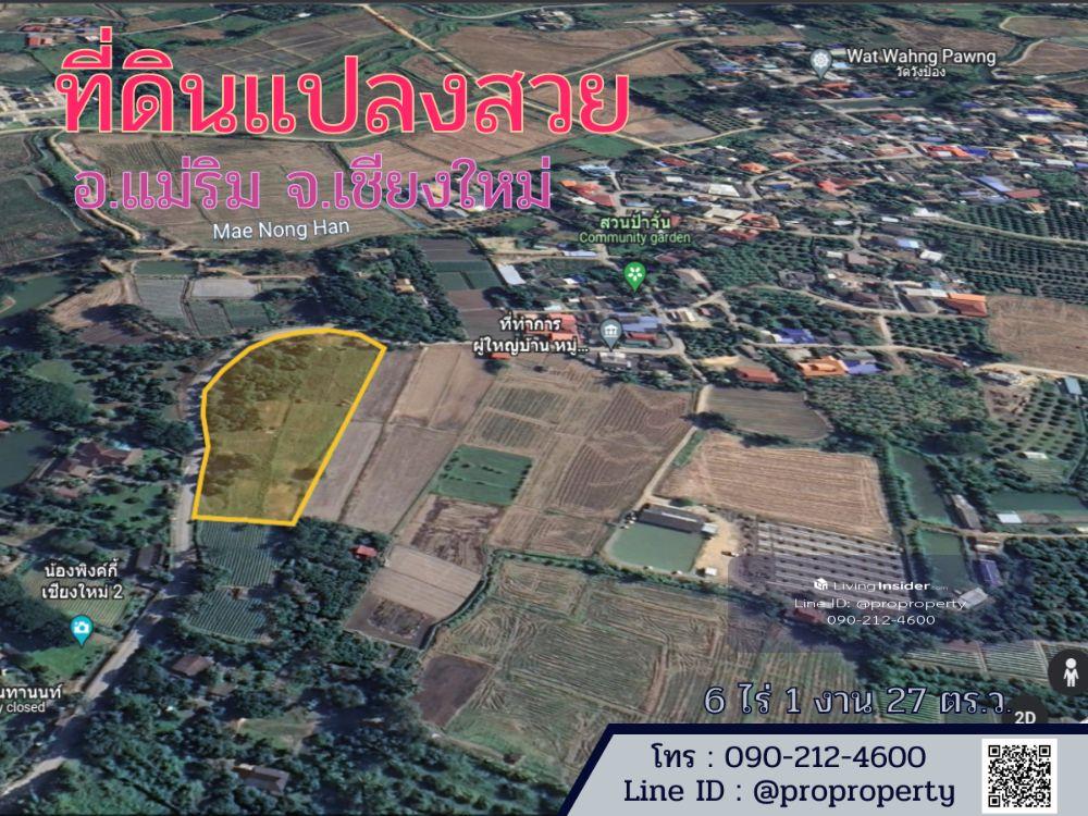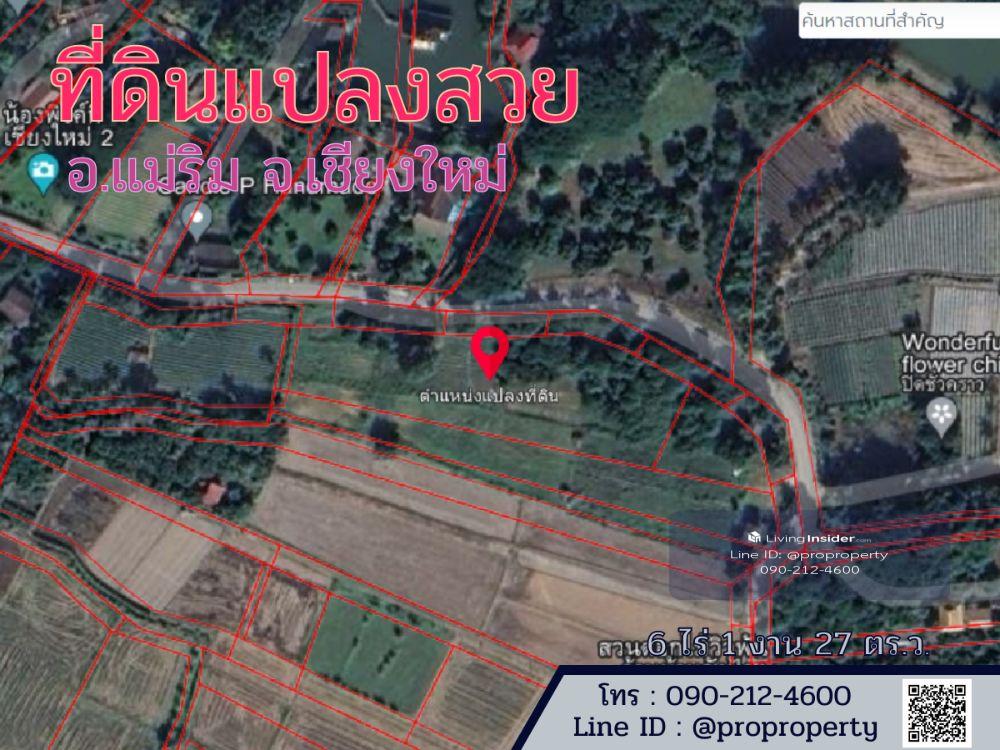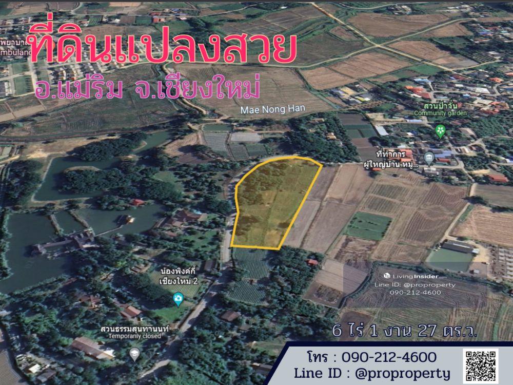 Land for sale in Chiang Mai Near the community, Mae Rim District, Mueang Kaeo Subdistrict, 6 rai 1 ngan 27 square wa Good location land near the community, Mueang Kaeo Subdistrict, Mae Rim District, size 6 rai 1 ngan 27 square wa, width on the north road, about 215 meters, green layout, suitable for villages, educational institutions, nursing service hospitals Selling price 20,220,000 baht (8000/SQ.W.) Property details: - Land size 6 rai 1 ngan 27 square wah - The land is a Red Garuda deed (Nor Sor. 4), all plots have been surveyed and ready to transfer. - Green layout, suitable for villages, educational institutions, hospitals, nursing service - The width of the road to the north, about 215 meters - The current land is a longan farm. Nearby places : - HomePro Chiang Mai 13.8 kilometers - Central Chiang Mai 13.1 kilometers - Chiang Mai Zoo 15.5 kilometers - Flower garden, thousand views, Ban Wang Pong, 0.24 km. - Mueang Kaew Municipality 3.0 km. - Nawamintrachuthit School, Payap 9.5 kilometers - Nakornping Hospital 8.1 kilometers - Wat Don Tan 2.0 kilometers - Bangchak gas station, Mae Rim branch, 10.4 kilometers +++ Make an appointment to see / ask for more information, please contact Line : @proproperty Khun L Tel : Contact number facebook.com/proproperty.th Services for selling houses, renting out, mortgages, selling consignments, ready to give advice.