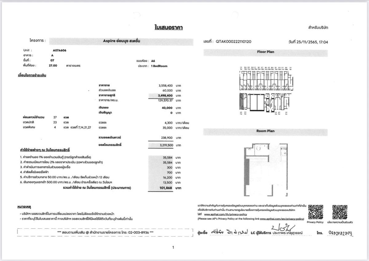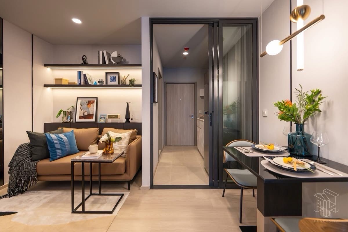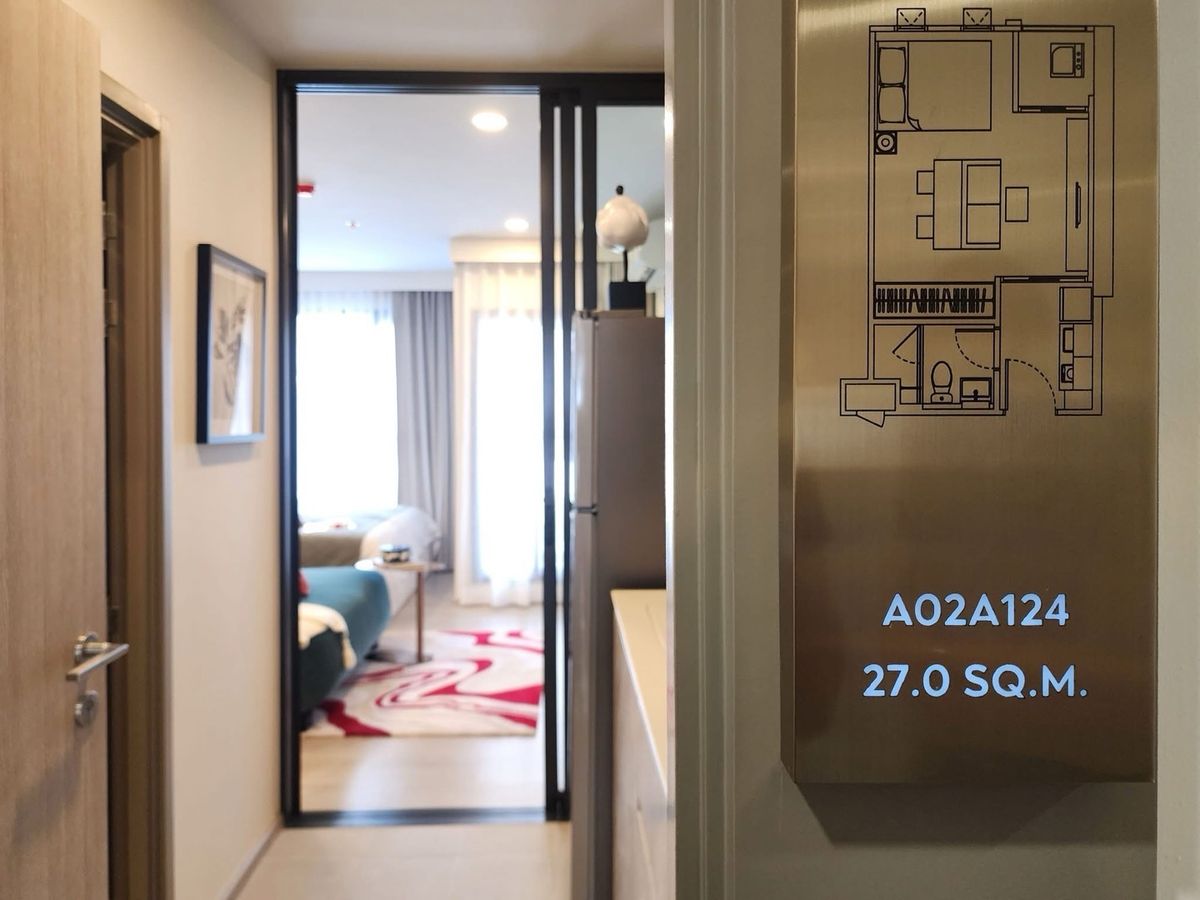 🏢 Selling down payment for a 27 sq m room. AP new layout, closed kitchen, has a view of the common area of ​​Intanin Hotel (EmQuartier Group) Selling down payment for Aspire Onnut Station 🚇 on Sukhumv