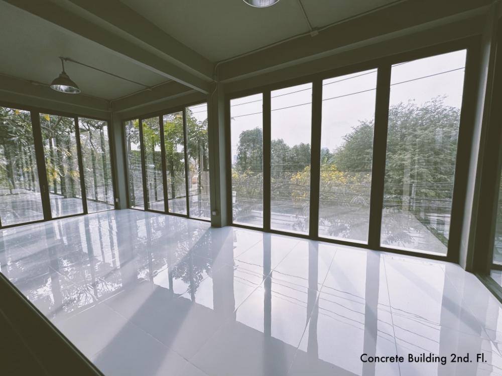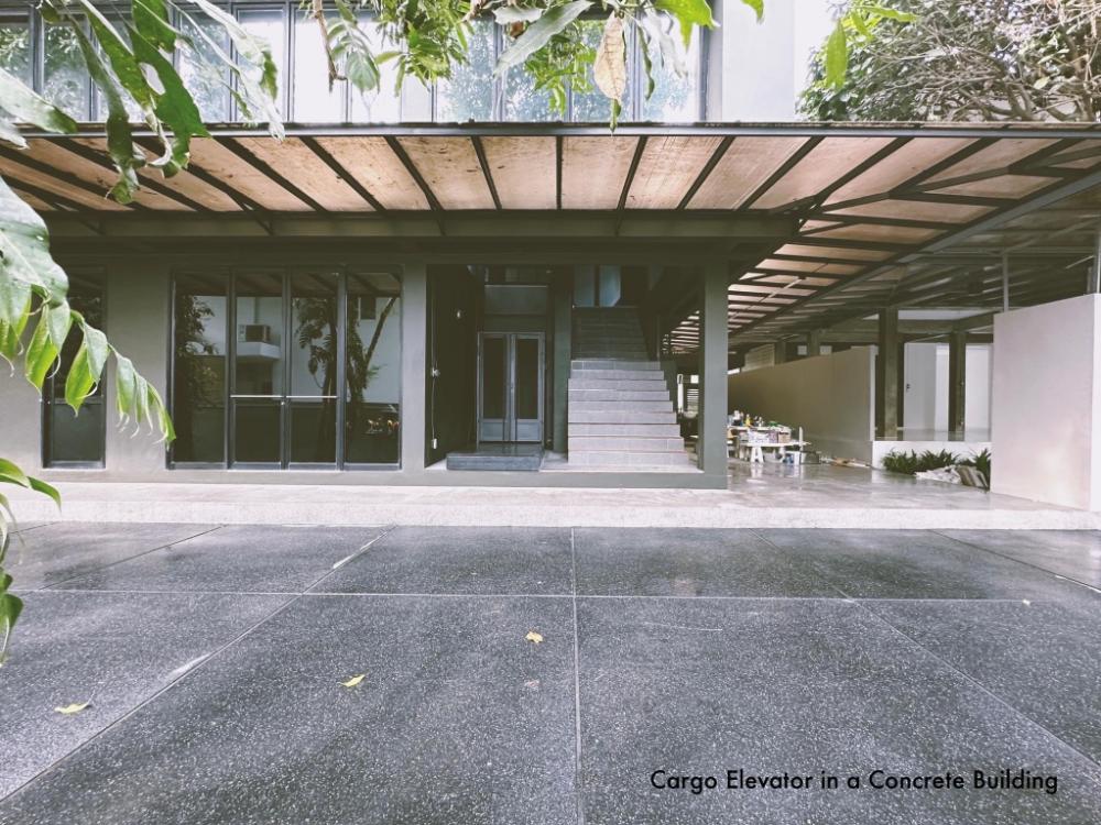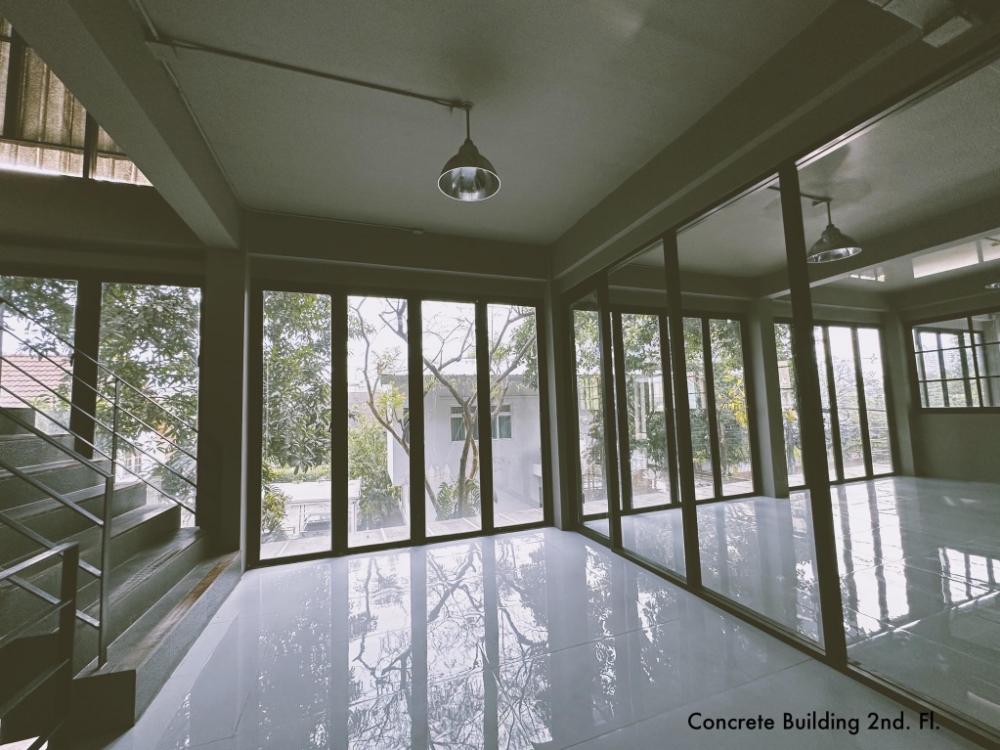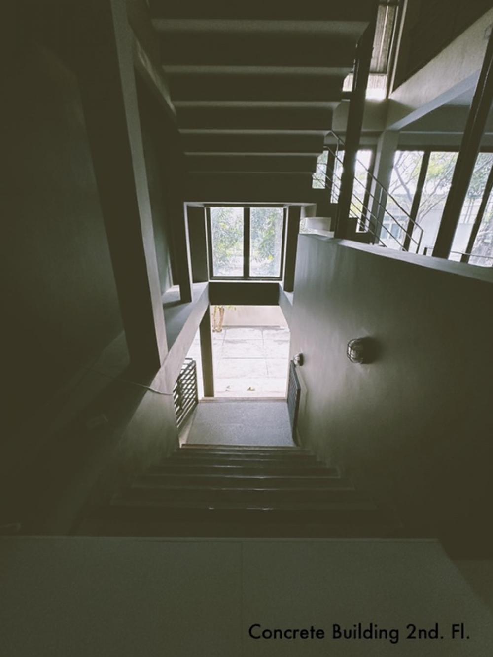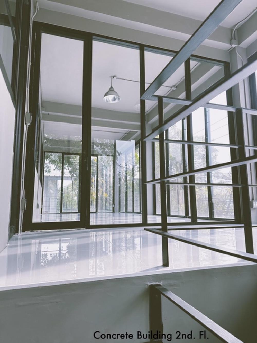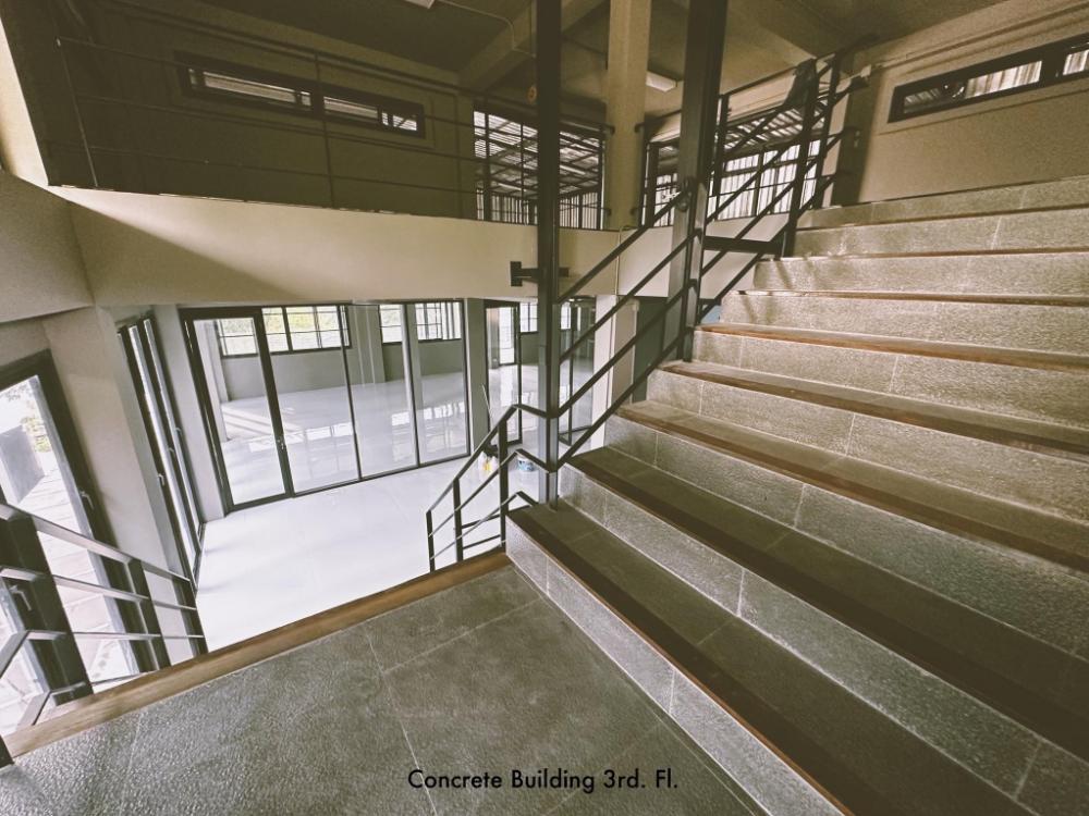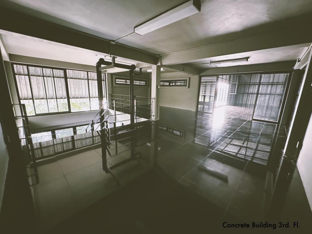The building in front is a 3-story cement building with a large staircase to the 3rd floor area and an elevator to take things to the 3rd floor area The house in the back is a 2-story wooden house, 5