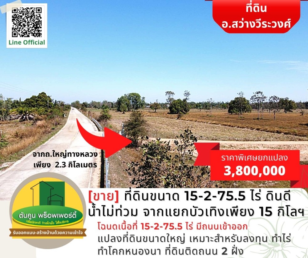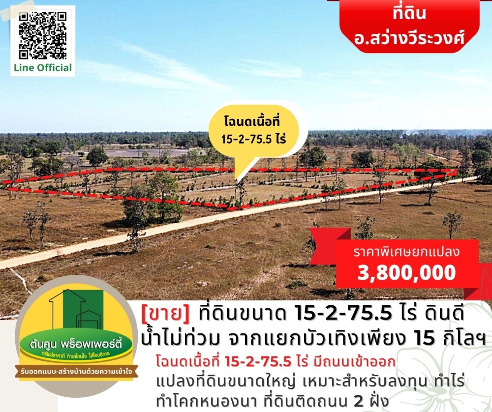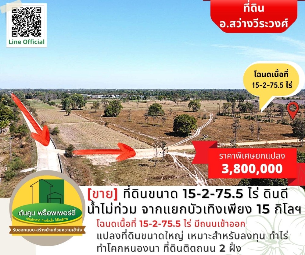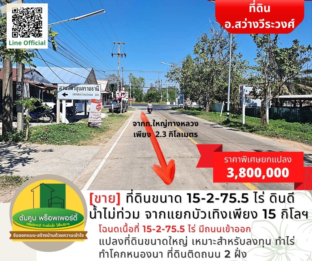 [Sell] Land size 15-2-75.5 rai, good soil, no flood water, about 15 kilometers from Bua Teng intersection. [Code TK-1944-B248] Highlights: 📣 Large plot of land Suitable for investment, farming, farming, Khok Nong Na ✅ Title deed, area 15-2-75.5 rai, with access roads, not difficult to find ✅ Land on 2 sides of the road, about 200 meters long ✅ Drive into the city to Big C in the city for only 30-40 minutes. ✅ or go to Lotus Phibun It takes about 25 minutes. 🎯 Location: https://goo.gl/maps/K4cYbhZGgCA7trqn8 Nearby places: Sawang Wirawong Hospital (3 kilometers), Sawang Wirawong Police Station (3.2 kilometers), Bua Thoeng Intersection (15.5 kilometers) Sale 3,800,000 baht (the cost of ownership transfer is half) ** Average less than 250,000 baht per rai ** 📢 Interested in making an appointment to see the house / land, chat with us at Line Official: http://line.me/R/ti/p/@rjg7947j -------------------------------- or contact for more information ☎️: Contact number (Chet Tonkoon) Line: @ubonproperty ☎️: Contact number (Ton Koon) -------------------------------- Follow more assets on the page. https://www.facebook.com/UbonRatchathaniProperty #Ton Koon Property consignment, consignment, rent, consignment, house/land for sale in Ubon Ratchathani # Ubon Realtor # House Builder # Ubon House # Ubon Land # Sawang Wirawong # Suan House # Warin House # Warin Land # Ready to Build House # Affordable Price