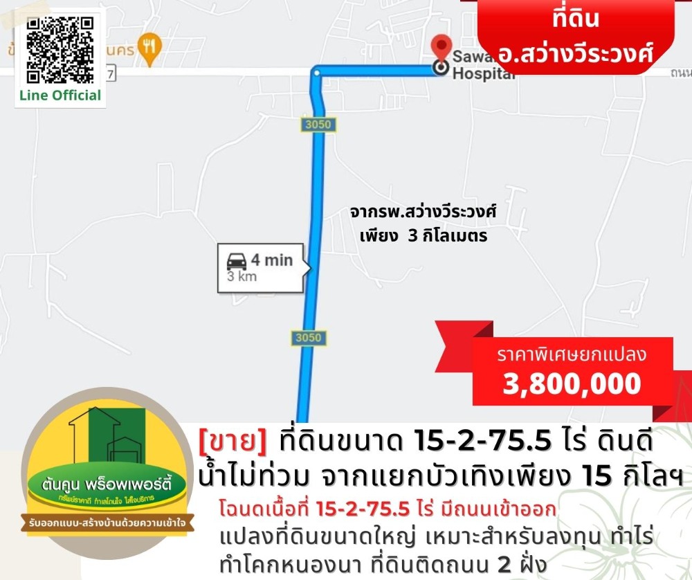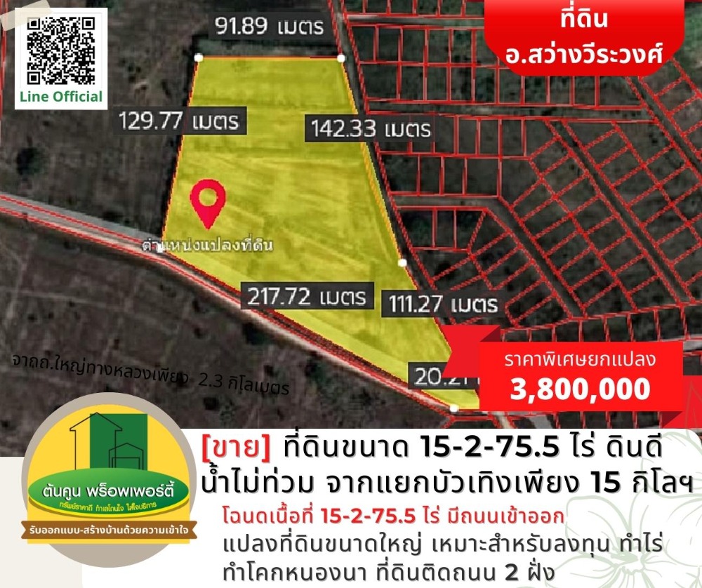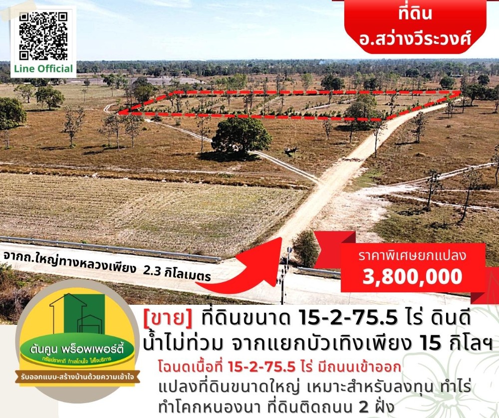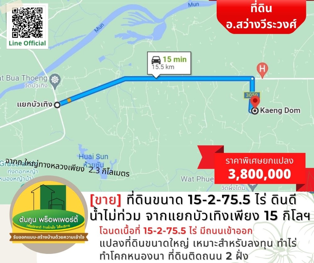 [Sell] Land size 15-2-75.5 rai, good soil, no flood water, about 15 kilometers from Bua Teng intersection. [Code TK-1944-B248] Highlights: 📣 Large plot of land Suitable for investment, farming, farming, Khok Nong Na ✅ Title deed, area 15-2-75.5 rai, with access roads, not difficult to find ✅ Land on 2 sides of the road, about 200 meters long ✅ Drive into the city to Big C in the city for only 30-40 minutes. ✅ or go to Lotus Phibun It takes about 25 minutes. 🎯 Location: https://goo.gl/maps/K4cYbhZGgCA7trqn8 Nearby places: Sawang Wirawong Hospital (3 kilometers), Sawang Wirawong Police Station (3.2 kilometers), Bua Thoeng Intersection (15.5 kilometers) Sale 3,800,000 baht (the cost of ownership transfer is half) ** Average less than 250,000 baht per rai ** 📢 Interested in making an appointment to see the house / land, chat with us at Line Official: http://line.me/R/ti/p/@rjg7947j -------------------------------- or contact for more information ☎️: Contact number (Chet Tonkoon) Line: @ubonproperty ☎️: Contact number (Ton Koon) -------------------------------- Follow more assets on the page. https://www.facebook.com/UbonRatchathaniProperty #Ton Koon Property consignment, consignment, rent, consignment, house/land for sale in Ubon Ratchathani # Ubon Realtor # House Builder # Ubon House # Ubon Land # Sawang Wirawong # Suan House # Warin House # Warin Land # Ready to Build House # Affordable Price