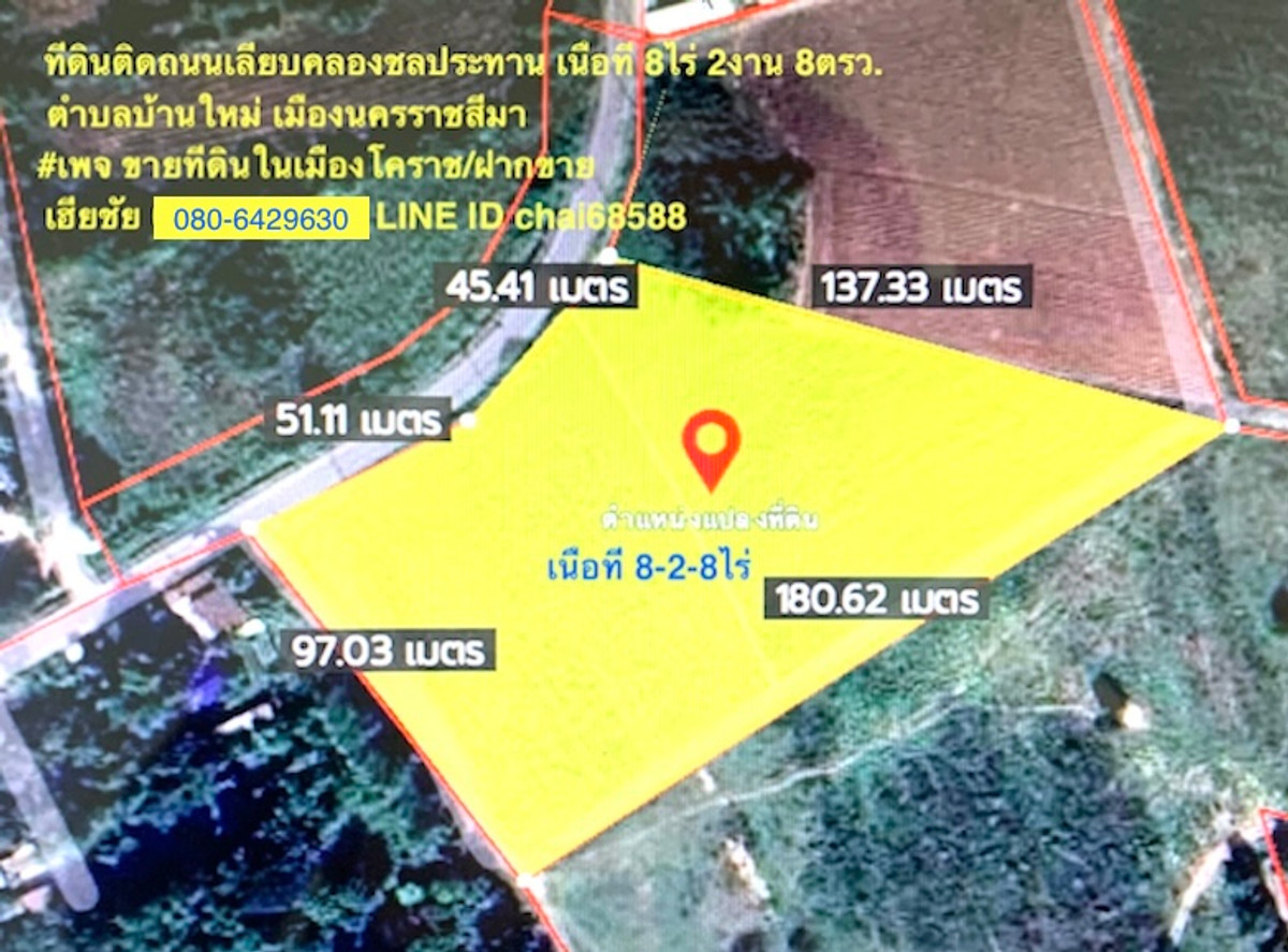 Land for sale next to the road along the irrigation canal. (Khlong Song Nam Road), area 8-2-8 rai, Ban Mai Subdistrict, Mueang Nakhon Ratchasima District, width 95 meters, depth 95 meters, land next to the road along the irrigation canal. Near Save One Market suitable for development as an agricultural garden house real estate development Near Thoet Thai Tan Khu market, price 3.5 million per rai, selling the whole plot for 29.8 million, please ask for more details. Contact Hia Chai Contact number LINE ID chai68588 https://web.facebook.com/chai68588 Beautiful land for sale Good environment Convenient location can enter and exit in many ways price is negotiable Want map coordinates or more information? Chat/Call to talk