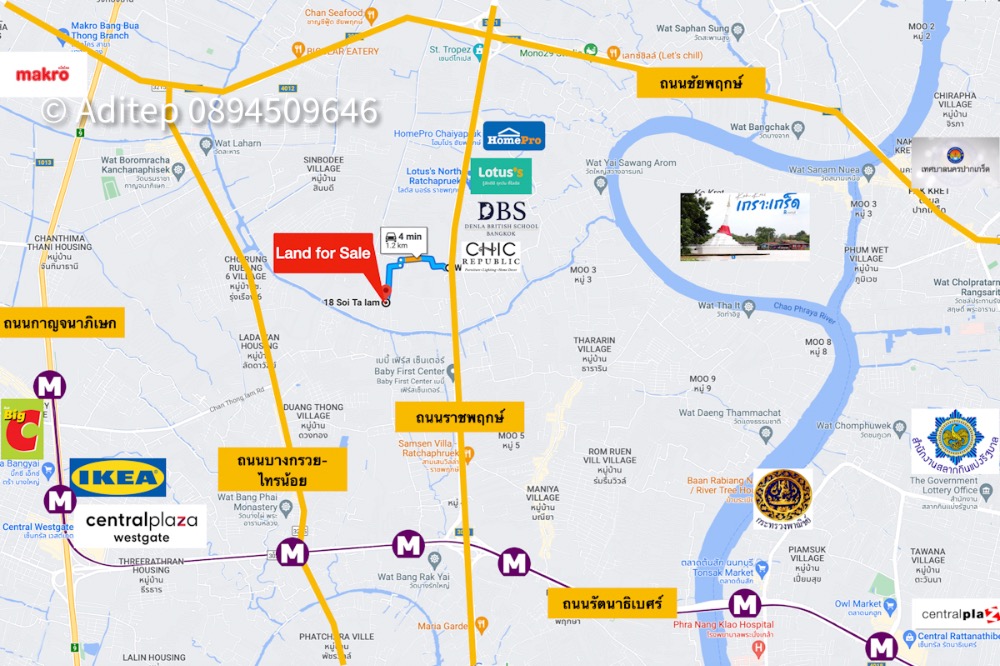 Property ID: M3513 Land for sale, Ratchaphruek Road, Nonthaburi, 4 rai behind Nonthaburi Wittayalai School, Soi opposite Chic Republic, Denla International School. --- VDO: [https://youtu.be/mUefOkG8pto] --- Location: Soi Tha Lan, Moo 1, Ratchaphruek Road, Om Kret Subdistrict, Pak Kret District, Nonthaburi Province Plot coordinates : (https://goo.gl/maps/M64LWoCd7NJzy9kb8) Area 4 rai width 85 meters next to concrete road Orange City Plan Yor. 5-6 --- **Sale 48,000,000 baht** (30,000 baht per square wah) Half of the transfer fee --- **Features :** 4 rai of land near Ratchaphruek Road, Pak Kret, Nonthaburi. Enter the alley from Ratchaphruek Road for only 1.2 km. Land behind Nonthaburi Wittayalai School, Soi opposite Chic Republic Near Denla International School, HomePro, Lotus, Starbucks, Ratchaphruek Wide frontage of land next to a concrete road. In the future, there will be a road project --- **Nearby places :** - MRT Purple Line, Bang Rak Noi Tha It Station - MRT Purple Line, Bang Rak Yai Station - Nonthaburi Wittayalai School - Denla International School (DBS Denla British School) - Chic Republic Ratchaphruek - Starbucks Ratchaphruek - Lotus North Ratchaphruek - Robinson Lifestyle Ratchaphruek - Thai Watsadu Chaiyaphruek - Index Living Mall Chaiyaphruek - HomePro Chaiyaphruek --- For more information contact Mr. Adithep Pramoradat Realty One Estate (Thailand) Co., Ltd. (under the Thai Real Estate Broker Association) Tel: Contact number LINE: @aditep.r1 or [http://line.me/ti/p/@aditep.r1](http://line.me/ti/p/@aditep.r1) email: Contact email WhatsApp: Contact number Facebook: [www.facebook.com/ArchangelProperty](http://www.facebook.com/ArchangelProperty) Website: [http://www.archangelproperty.com](http://www.archangelproperty.com/) #Land for sale #Land for sale Ratchaphruek #Land for sale on Ratchaphruek Road, Pak Kret #Land for sale on Ratchaphruek Road, Nonthaburi #Land for sale Nonthaburi #Land in Nonthaburi, the owner sells by himself. #Land for sale on Ratchaphruek Road, 5 Rai #Land for sale on Ratchaphruek Road, Nonthaburi 1 #Land on Ratchaphruek Road, 1 Rai #Land for sale on Ratchaphruek Road, the owner sells by himself. #Land for sale Rama 5 #Land for sale Ratchaphruek 30 #Land for sale on Nonthaburi main road #Land for sale in Ratchaphruek, new cut #Land for sale Ratchaphruek Rattanathibet #Land of Bang Rak Noi #Land near Denla #Land near International Denla #Land near Den La School