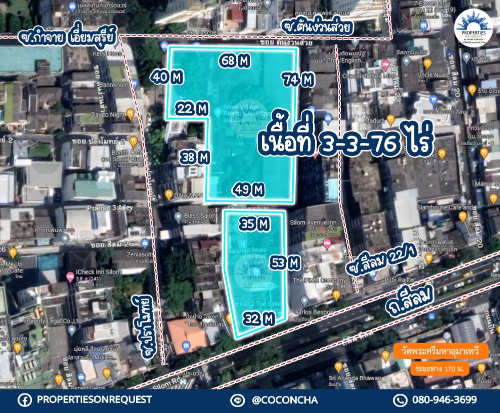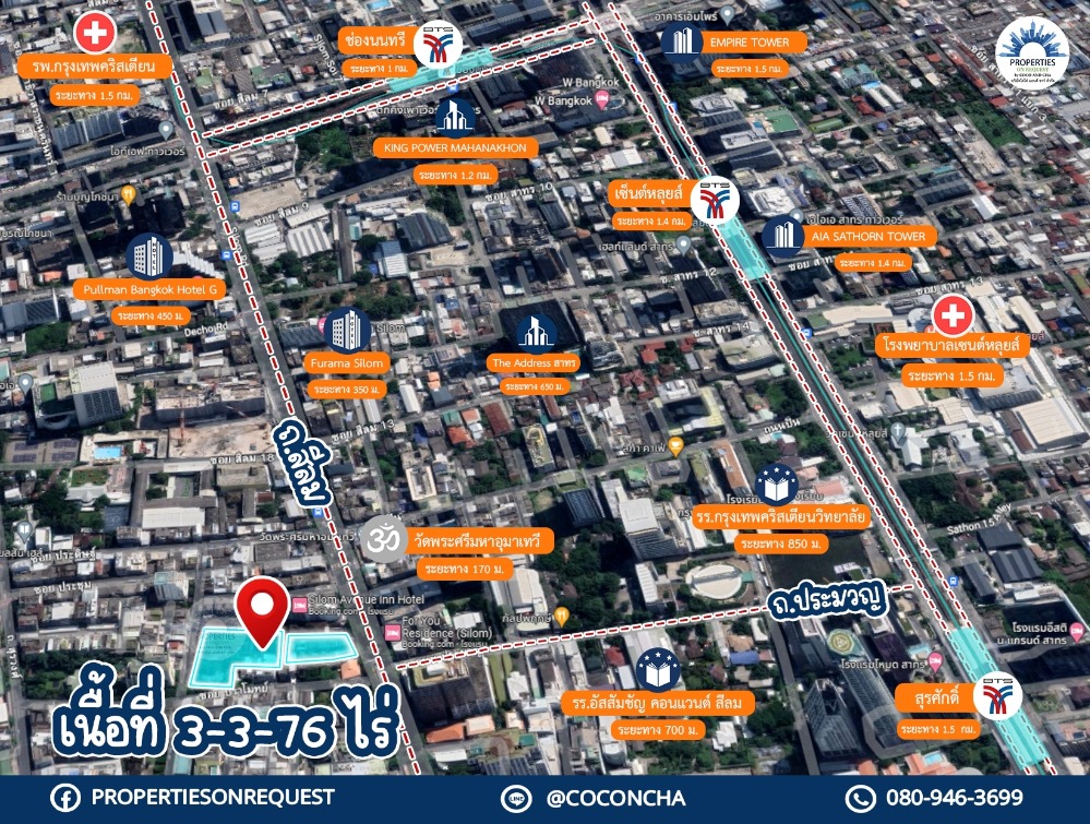 📌Total area: 3-3-76 rai (1,576 square wah) Location: Silom Road, Suriyawong Subdistrict, Bang Rak District, Bangkok 10500 🔥Wholesale price: 3,000 million baht (1,903,554 baht per square wah)**including transfer fees - taxes 🔎Details: ✅ Land in the red area, Por. 5-6 ✅ The front of the land is next to Silom Road, about 30 meters wide - the side is next to Soi Pramote, about 40 meters The back is on Tan Nguan Suai Road, only 66 meters away from Central Silom Department Store, only 300 meters ✅ Approximately 600 meters from the train station. Type of office building, commercial building, department store, hospital, apartment, hospital, condominium ✅ Selling with all buildings Consists of a hotel (Silom Village), souvenir shops, restaurants, property owners ✅ Approved Designed Able to build a high-rise building of approximately 39 floors and 54 floors ✅ Suitable for building business Commercial buildings, restaurants, apartments, offices (Home Office), residential houses, hotels, condos, and others, etc. 📌 Nearby location: ❎ Near Krung Thai Bank, Silom branch, only 650 meters (8 minutes) ❎ Near Assumption School, only 750 meters (10 minutes) ❎ Near Bangkok Bank Headquarters, only 950 meters (12 minutes) - Near Chulalongkorn Hospital, Thai Red Cross Society, only 1.8 km (9 minutes) ❎ Near Hua Lamphong Temple, only 2.2 km. (8 minutes) ❎ Near Sam Yan PTT gas station, only 2.5 km. (11 minutes) ❎ Near Chulalongkorn University, only 3.0 km. (10 minutes) ❎ Near Traimit Wittayaram Worawihan Temple, only 3.1 km. (10 minutes) ❎ Near the Four Seasons Hotel, only 3.1 km. (11 minutes) ❎ Near Central World, only 3.5 km. (14 minutes) ❎ Near Asiatique The Riverfront, only 3.6 km. (14 minutes) ❎ Near The Platinum Fashion Mall, only 4.1 km. (17 minutes) ❎ Near Susco Sathupradit gas station, only 4.3 km. (14 minutes) ❎ Near Krungthai Bank ATM @ Pathumwan, only 4.3 km. (17 minutes) ❎ Near ICONSIAM, only 4.4 km. (14 minutes) ❎ Near Pratunam Market, only 4.4 km. (19 minutes) ❎ Near BTS Wongwian Yai, only 4.8 km. (10 minutes) ❎ Near Nonsi Wittaya School, only 4.9 km. (14 minutes) ❎ Near Bangchak-Rama 3 gas station, only 5.3 km. (14 minutes) ❎ Near Central Rama 3, only 5.7 km. (11 minutes) ❎ Near Sarasas Pattana School, only 5.8 km. (13 minutes) ❎ Near Krung Thai Bank, Saphan Khao Branch, only 6.0 km. (12 minutes) ❎ Near BRT, Rama 3 Bridge, only 6.0 km. (15 minutes) ❎ Near BTS Phrom Phong Station, only 6.3 km. (21 minutes) ❎ Near Terminal 21, only 6.4 km. (19 minutes) ) ❎ Near ATM, Siam Commercial Bank, only 6.9 km. (18 minutes) ❎ Near Kru Wee market, only 7.0 km. (15 minutes) ❎ Near Phlu Market, only 7.6 km. (16 minutes) ❎ Near Arun Ratchawararam Temple, only 7.6 km. (23 minutes) ❎ Near BRT Wat Pariwat, only 8.3 km. (18 minutes) ❎ Near BRT Wat Dan, only 8.5 km. (14 minutes) ❎ Near BTS Bang Wa, only 9.2 km. (15 minutes) ❎ Near Rat Burana Hospital, only 10.0 km. (18 minutes) ❎ Near Bang Pakok 9 Hospital International only 10.8 km (21 minutes) ❎ Near Siriraj Hospital Piyamaharajkarun, only 11.6 km. (22 minutes) Land coordinates: https://goo.gl/maps/AwaKY9uoRnw9pdpU6 Interested contact..👇👇 🏡 Properties on Request by COCO and CHA 📞Phone no.: Contact number 📧 Email: Contact email 🌐 FB: https:/ /bit.ly/2DJwnkA 📱Line ID: @coconcha