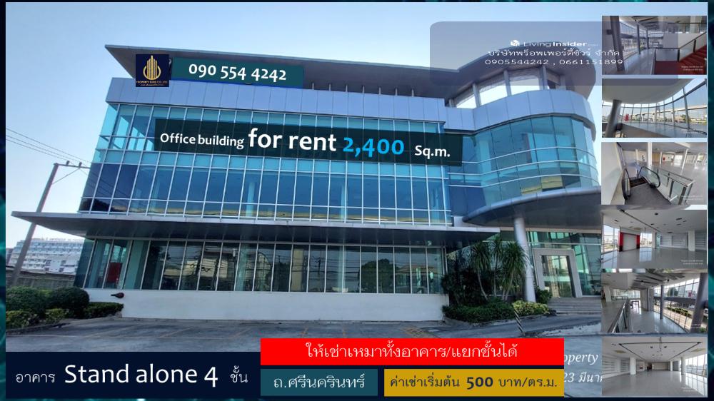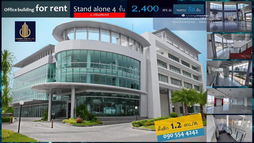 Office building For rent Please contact Interested in making an appointment to see or ask for more information, please contact 📲 Phone: Khun Arm Contact number LINE : @propertysure 📲 Phone : Office Contact number Showroom & Office building for rent Stand alone office for rent on Srinakarin Road Near Seacon Square and Suan Luang Rama IX Park (can be rented by floor) • Building 1, next to Srinakarin Road, 4 storeys, approximately 2,400 sq m. • 1st floor Showroom&Shop Duble volume, height 9 meters, area 750 sq m. • 2nd building in the back, 4 floors, approximately 3,000 sq.m. (3rd and 4th floors available) • Parking for 80-90 cars • Outstanding modern building on Srinakarin Road • Next to BTS • Suitable for organizations that need a private office. • Suitable for organizations that require flexibility in their work without limiting time in-out or working time. Rent the whole building Area about 2,400 square meters, total rental fee 1,200,000 baht/month (negotiable price) Location: Srinakarin Road, Nong Bon Subdistrict, Prawet District, Bangkok 10250 Details : details | 4-storey office building on 2 rai of land | The area of each building is about 2,400 sq m. | 80 parking spaces | 1 passenger elevator | 1 escalator Can be rented by floor | There are bathrooms on every floor | Floor 1 Showroom&Shop Area about 750 sq.m. Rental fee 650 baht/sq.m. Total 487,500 baht/month | 2nd floor, office area 600 sq.m., rental fee 500 baht/sq.m., rental fee 300,000 baht/month | 3rd-4th floor, office space, 536 sq.m. per floor, rental fee 500 baht/sq.m., rental fee 268,000 baht/month/floor | Minimum 3 year contract : Minimum 3 year contract | 3 Months Deposit | 2 Month advance rental : 3 months deposit | 2 months advance rental agent provided by Property Sure Co., Ltd. : Property Sure Co.,ltd. Sure about renting, buying, selling real estate Buy-sell-rent houses, buildings, offices, land, condos Get marketing management All types of real estate