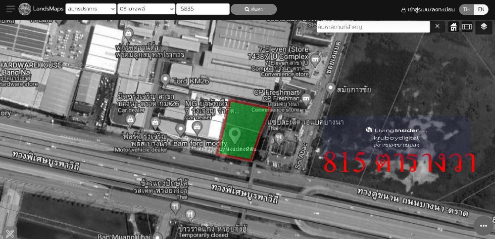 At Bangna km.26 outbound 815 square wah (or about 2.0375 rai) the owner sells himself The land is rectangular Selling 100,000 baht per square wah Nearby places: - Next to MG car center, MG Rungcharoen