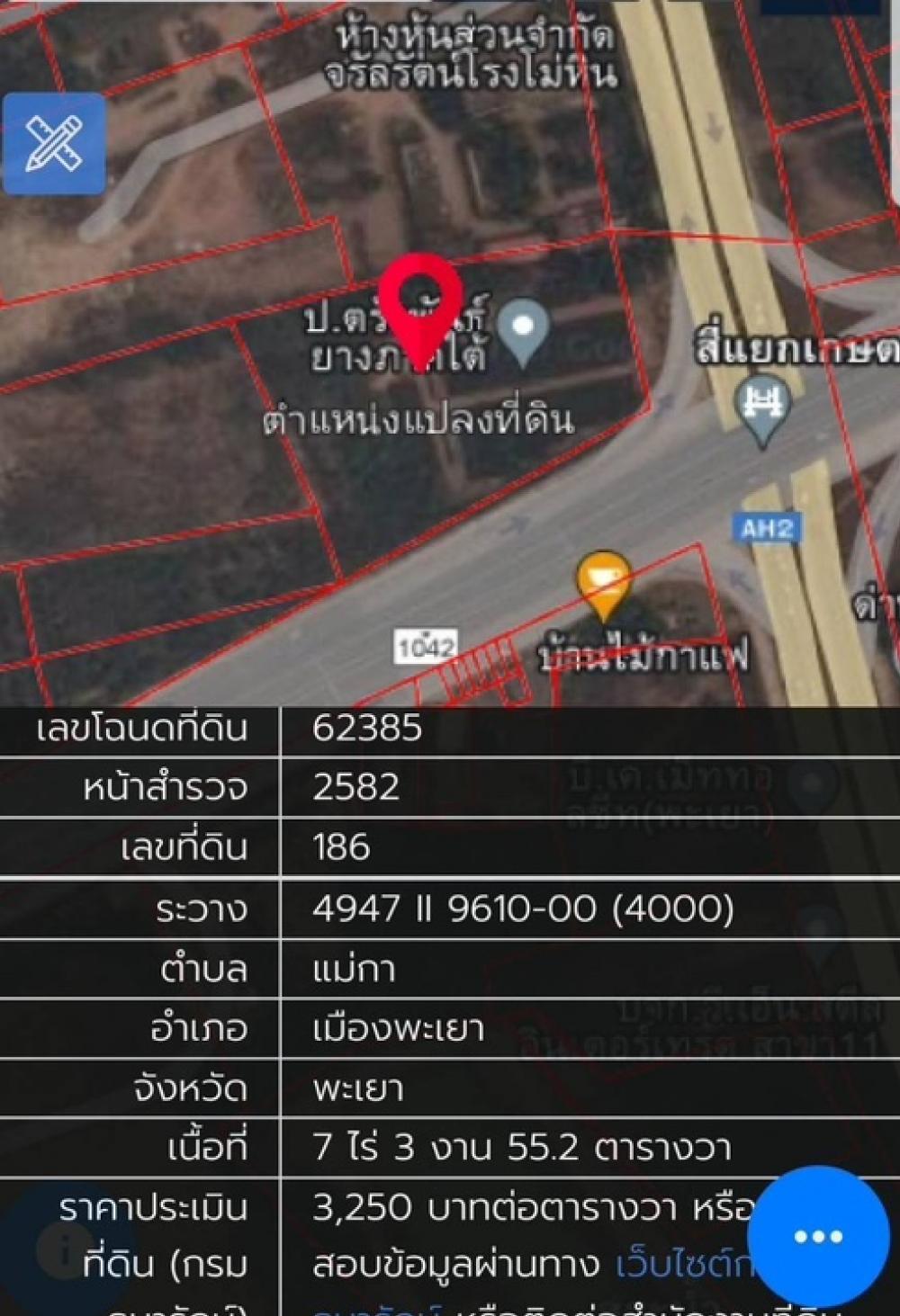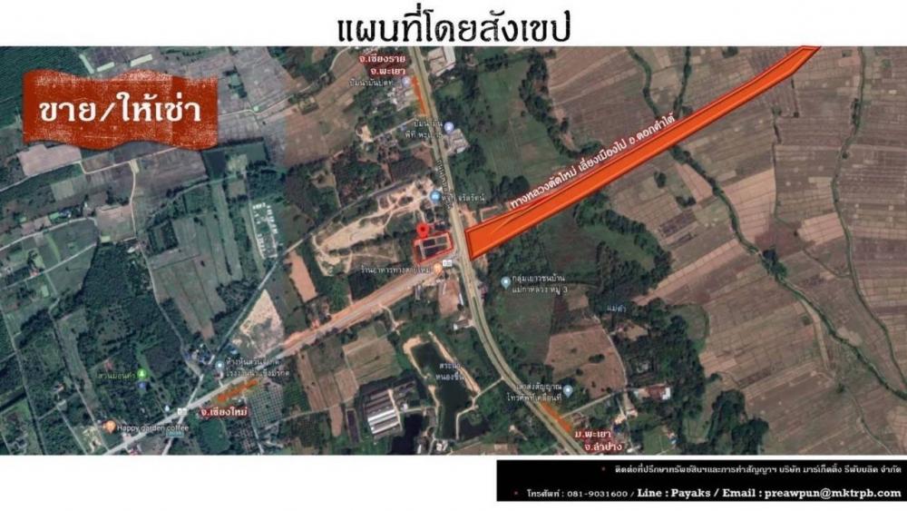 Land for sale in Phayao Province Land for sale Prime location, cheapest price in the area Mae Ka Subdistrict. Mueang Phayao District, Phayao Province Next to Phahonyothin Road, going out to Chiang Rai Province, Chiang Mai Province , area size 7 rai 3 ngan 55.2 square wah 2. Next to the main road, going out to Chiang Mai Province, Chiang Rai Province, easy to go to University of Phayao 3. Suitable for restaurants, commercial buildings, office buildings, flea markets, showrooms, gas stations, building residential houses, department stores, hotels, resorts. 4. Rent out for others to use. 5. Land next to the main road on both sides Seller contact information Kathana Peter Tel. Contact number