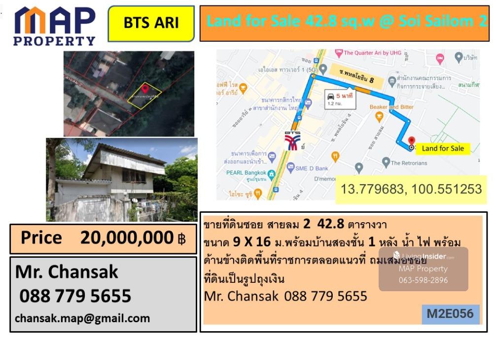 Land for sale in Soi Sai Lom 2 with 1 two-story house, plot next to a green garden - Land for sale in Soi Sai Lom 2 with 1 two-story house - Width 9 meters, depth 19 meters - Plot next to a beautiful green garden, near BTS Ari, located in - Area mostly residential, quiet, safe - There are many shortcuts to the main road - Interested in asking for more information or making an appointment to see the house at - Contact Agent: Mr. Chansak Contact number - Addline: https://line.me/ti/p/hIQ_UdzHL9 - Email: Contact email
