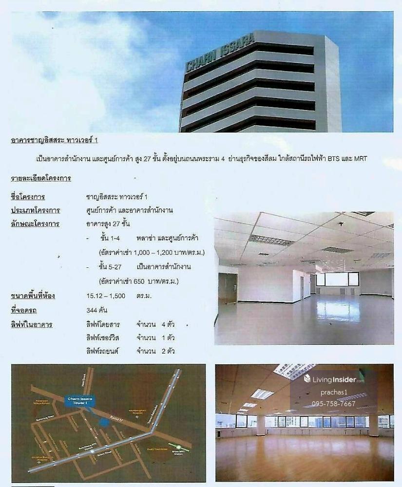 Office space for rent, Charn Issara Building 1, CHARN ISSARA TOWER 1, 5th floor, area 60 square meters, rental fee 39,000 baht*/month (650 baht per square meter) Office building for rent on Rama 4 Road. Inside the building there are various amenities such as restaurants and shops. It is also close to BTS and MRT Sala Daeng stations, with a total rental area of ​​approximately 8,400 sq m Building name: Charn Issara Building 1 Lease period: 1-3 years Location: Rama IV Road Height: 27 floors Year built: 1985 Area: 8,400 sq m Room size: 15.12 – 1,500 sq m Each floor area: 380 – 3,427.14 sq m Total rental area: 19,198.91 sq m Available rental space: 24.3 – 817.58 sq m Rental rate: 650 baht*/sq m Split Type air conditioning system Electricity bill according to the electricity authority's rate Water bill: 20.00 baht/unit Parking fee: 2,000 baht/month *Conditions are as determined by the company Chan Issara Tower 1 https://maps.app.goo.gl/wNKpoPoyHji8RBGLA Contact for inquiries Tel. Contact number S.E.T.Business