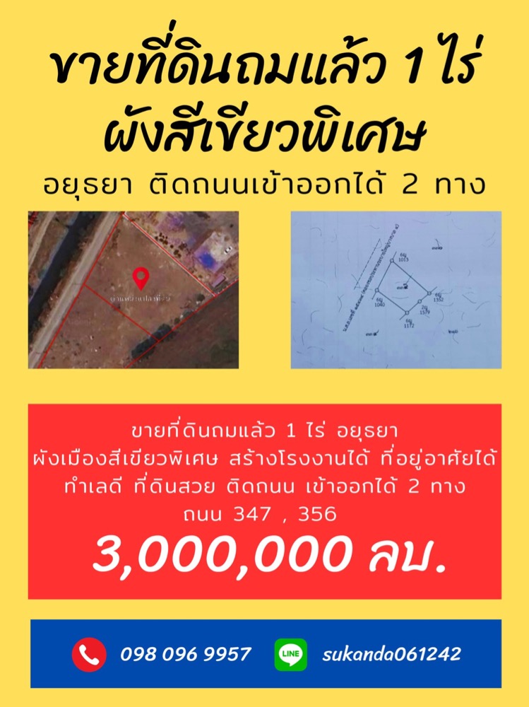 🔥1 rai of land for sale, Ayutthaya🔥 ✅ Special green city plan ✅ Adjacent to the road, accessible in 2 ways ✅ 700 meters from roads 347 and 356 ✅ Wide land front ✅ Can build a factory or a residence 🔥For sale only 3,000,000 million baht Contact Contact number Line: sukanda061242