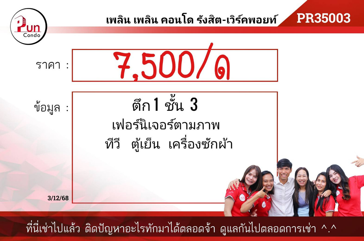 😊 The room has arrived. #For Rent Ploen Ploen Rangsit Workpoint, beautiful condo near Workpoint Studio Ready to move in!! Building 1, Floor 5 * Furnished as in the picture (PR32005) Rent 6,000 ฿/month ✴️ Electrical appliances - 2 air conditioners - Refrigerator- Water Heater ✴️ first payment -1 month advance rental -2 months deposit *Rental fee includes common fee ——————————————————————— 💌 Please contact. Condo for rent in Rangsit area ☎️: Contact number 🛎️Line ID: @pun-condo(with@) Click ➡️ https://line.me/R/ti/p/@pun-condo 🛎️inbox ➡️ https://m.me/Ploenploencondorangsit ✨See all Ploen Ploen Condo Workpoint ➡️ https://bit.ly/3EJxew8 ——————————————————————— # Ploen Ploen Condo Rangsit - Nakhon Nayok for rent. #Ploen Plearn Plus Rangsit Future for rent #Plern Plearn Plus Rangsit Future Park for rent #Ploen Ploen Plus Rangsit Future Park for rent #For Rent Ploen Ploen Condo #Beautiful condo, cheap price #Near workpoint