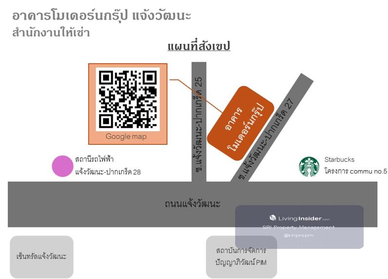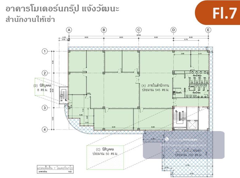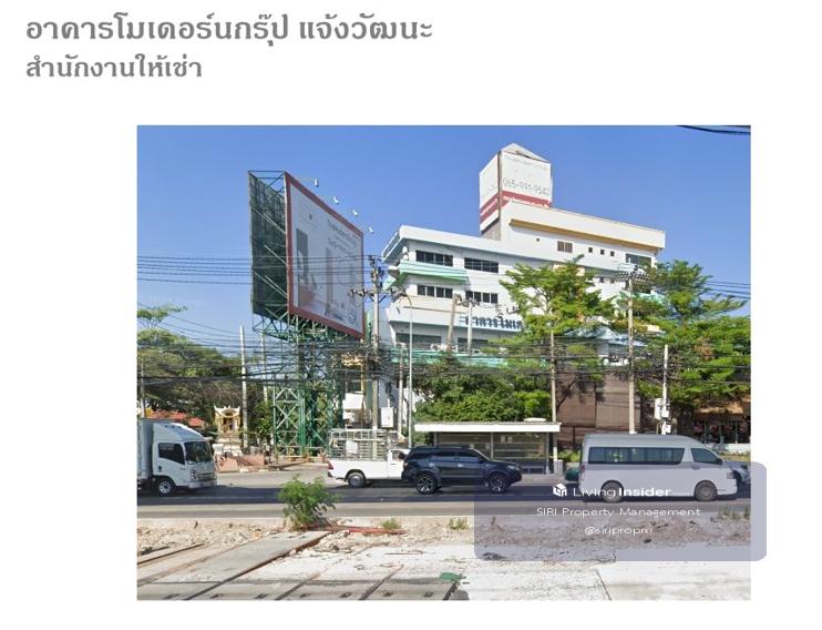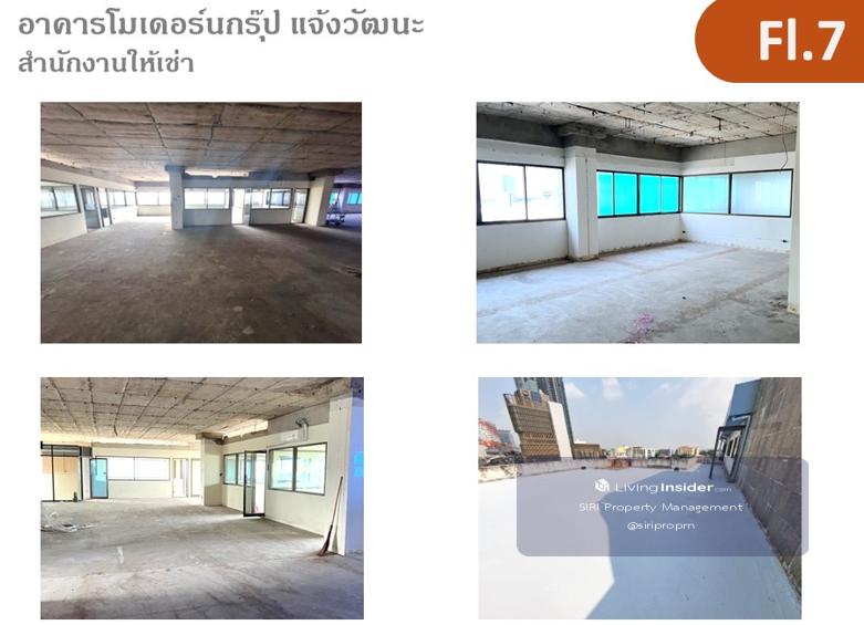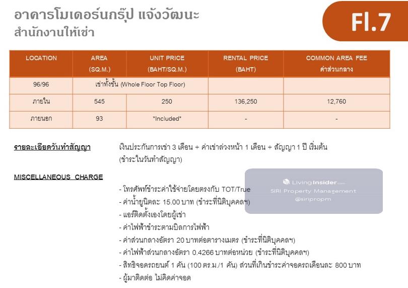 Office, 7th floor, Modern Group Tower, Pakkred-Chaengwattana Internal area 545 sq m. Outside area 93 sq m. Total 638 sq m. - Parking rights for 1 car per 100 sq m. - Visitors do not charge for parking - Water fee is 15 baht per unit -Electricity bill paid according to the electricity-air bill Tenants install it themselves -Common fee 20 baht per square meter - Central electricity fee at the rate of 0.4266 baht per square meter Contact Tel: Contact number Line: @siripropm