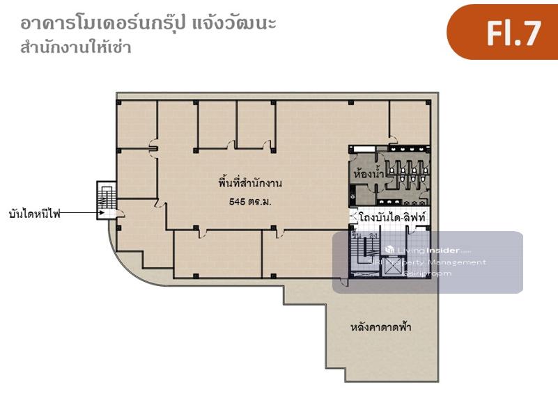 Office, 7th floor, Modern Group Tower, Pakkred-Chaengwattana Internal area 545 sq m. Outside area 93 sq m. Total 638 sq m. - Parking rights for 1 car per 100 sq m. - Visitors do not charge for parking