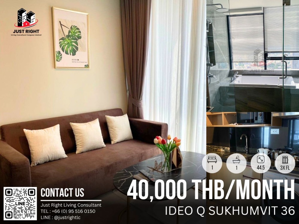 For Rent Ideo Q Sukhumvit 36 1 Bed 1 Bath 44.5 Sqm. High Floor 3x City View 40,000 THB/month *Chinese Below* -------------------------------------------------- Room Code : Contact number Type : 1 bedroom, 1 bathroom Size : 44.5 square meters Floor : 3x Furniture and electrical appliances : Fully Provided, Ready to move-in Rental price : 40,000 baht per month *1 month in advance, 2 months deposit* *Minimum contract period 1 year* -------------------------------------------------- For viewing appointment or further more information please contact Tel : Contact number Line : @justrightlc WhatsApp : Contact number WeChat ID : k Contact number Website : www.justrightlc.com ** If you looking for renting or purchasing condo for in a nearby location, Please feel free to contact us for more information or consultation ** ** If you prefer to rent out or sell out your condo, Please feel free to contact us or consultation ** -------------------------------------------------- 代码 : Contact number 户型 : 1 间卧室,1 间浴室 面积:44.5 平方米 楼层:3x 家具电器:全包,可以马上入住 租金:每月 40,000 泰铢 入住前付款:1 租+ 2 押金 最短合同期1年 -------------------------------------------------- 如果您有兴趣需要进一步的资料,约看房,请您立即联络,我们有中文服务销售 电话: Contact number 线路:@justrightlc 瓦次艾普 : Contact number 微信号:k Contact number(扫二维码) 网站:www.justrightlc.com ** 如果您在寻找附近公寓出租或购买,请您联系我们获取更多信息或咨询 ** ** 如果您有房源需要出租/出售 请您联系我们获取更多信息或咨询 **