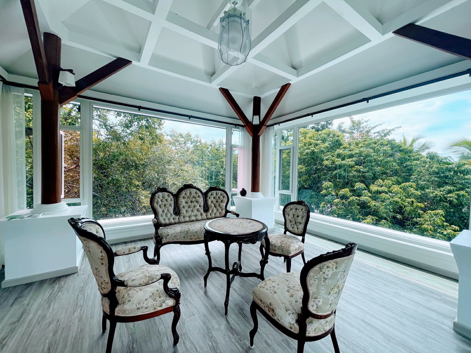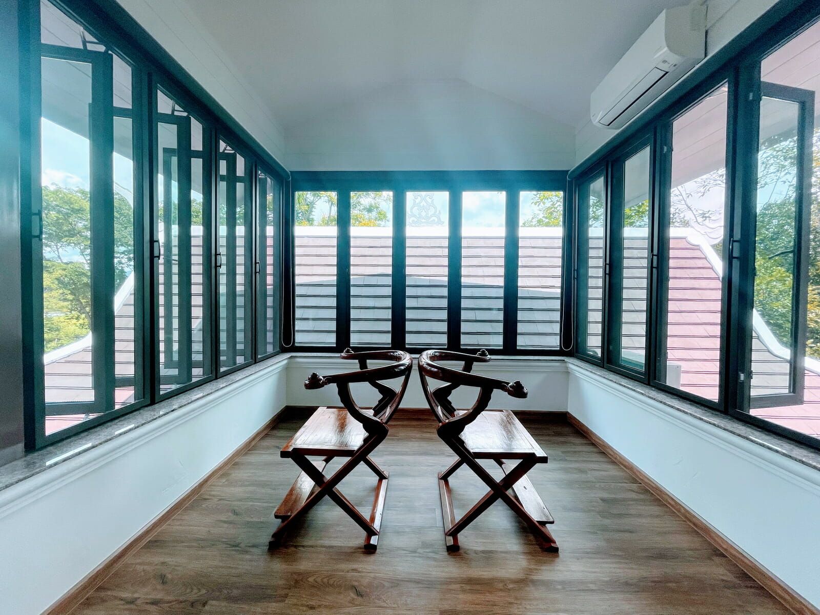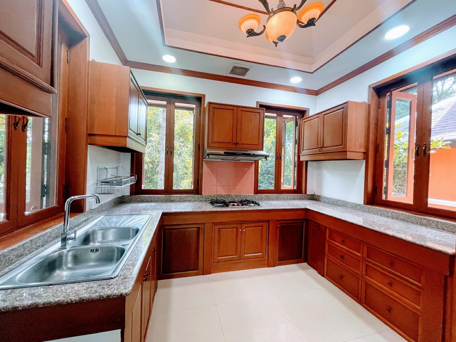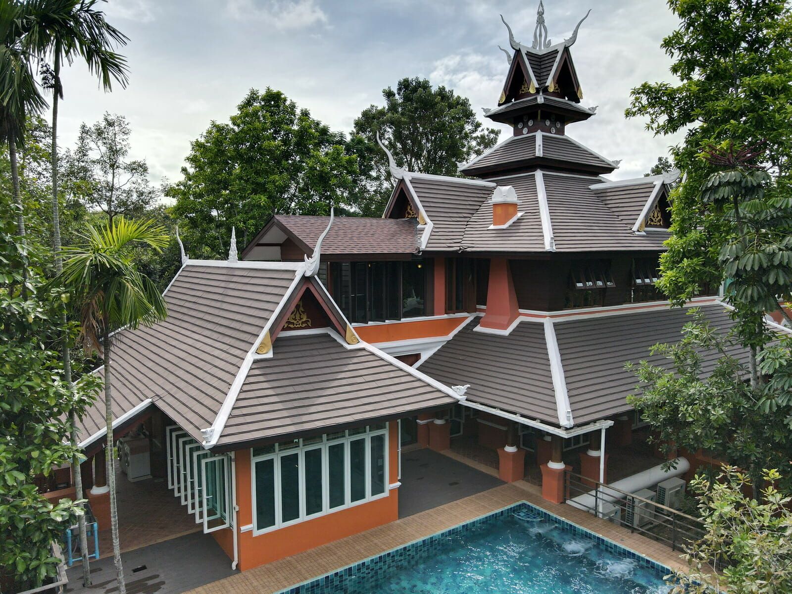Absolutely unique 3-bedroom pool villa built on a small island surrounded by lush garden in Mae Rim. This property, renovated from a classic building and finished with luxury touches, blends classic Lanna architecture with the beautiful natural surroundings of Mae Rim with easy access to town and Prem International School.The house is surrounded by the lake with the only access via the front gate and a small bridge at the back. The first floor has a large living room with two guest bedrooms, both with en-suite bathrooms, just off it, a large dining room, and a western style kitchen. There is also an outdoor Thai kitchen/BBQ area and pool overlooking the lake.The second floor is designed effectively as a large master bedroom suite with grand vaulted ceiling on the main landing which serves as a lounge area, the master bedroom win which has a large en-suite bathroom, walk-in closet, and private balcony, and accessed over a small, elevated walkway, a meeting or tearoom with beautiful views of the surrounding lake and garden.